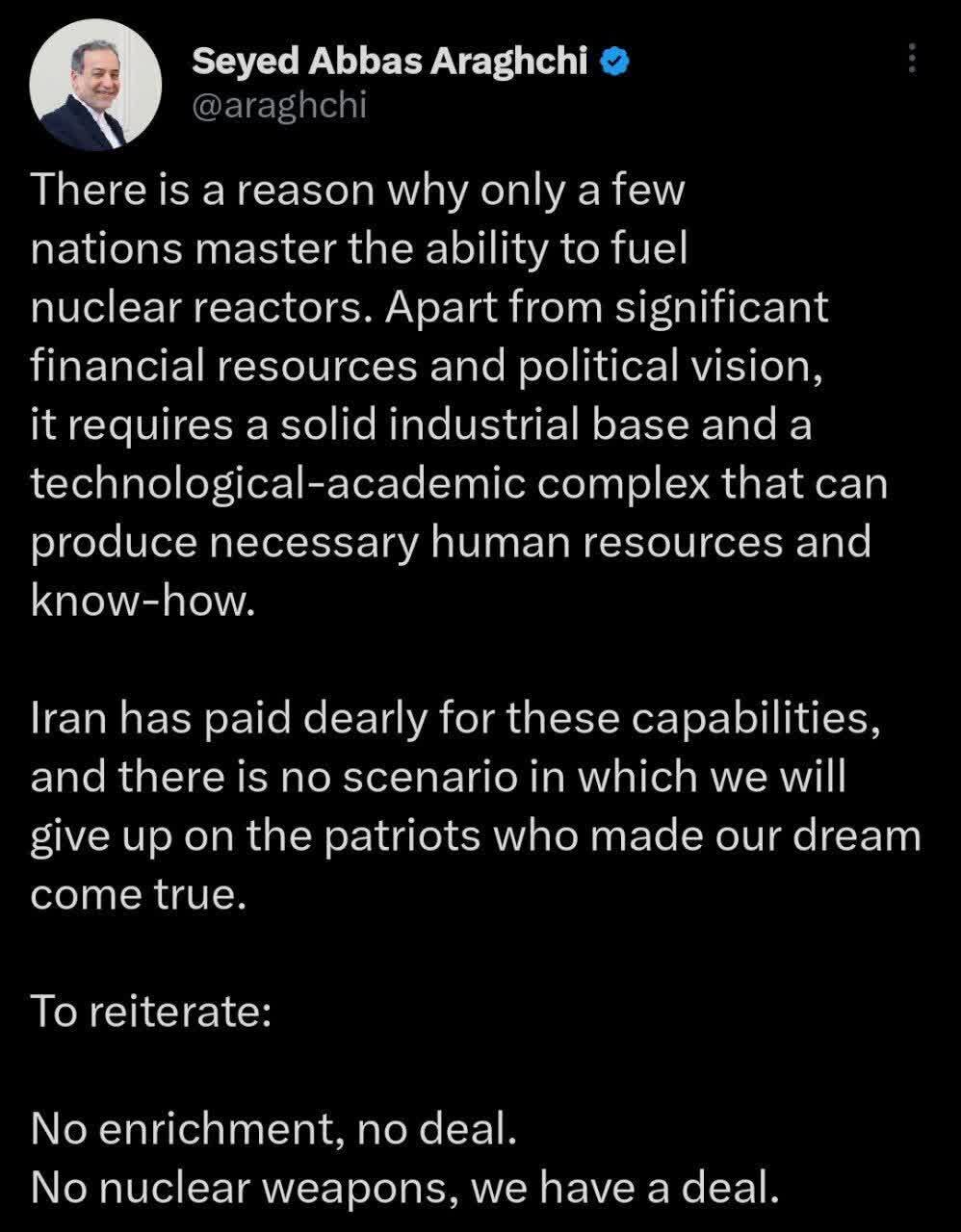 به گزارش خبرگزاری ایمنا و به نقل از پایگاه اطلاع‌رسانی دولت، سید عباس عراقچی در صفحه شخصی خود در شبکه اجتماعی ایکس نوشت: «دلیل روشنی وجود دارد که چرا تنها تعداد کمی از کشورها توانایی ساخت سوخت راکتورهای هسته‌ای را به‌دست آورده‌اند. این امر، افزون بر نیاز به منابع مالی قابل توجه و یک نگاه سیاسی راهبردی، مستلزم برخورداری از یک زیرساخت صنعتی نیرومند و یک منظومه فناورانه–دانشگاهی است که توان تولید سرمایه انسانی و دانش فنی مورد نیاز را داشته باشد.