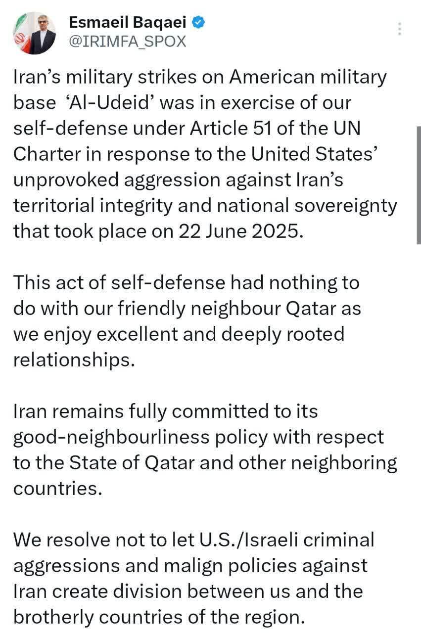 «ضربات موشکی ایران به پایگاه آمریکایی «العدید» در اجرای حق دفاع مشروع طبق ماده ۵۱ منشور سازمان ملل متحد و در پاسخ به تجاوز نظامی آمریکا در ۲۲ ژوئن ۲۰۲۵ علیه تمامیت ارضی و حاکمیت ملی ایران انجام شد. این اقدام دفاعی بههیچعنوان نباید علیه کشور دوست و همسایه، قطر، تلقی شود و جمهوری اسلامی ایران به روابط حسنه و ریشهدار خود با آن کشور متعهد است. ایران همواره به اصل حسن همجواری با قطر و دیگر کشورهای همسایه پایبند است، ما مصمم هستیم اجازه ندهیم اقدامات تجاوزکارانه و سیاستهای شرورانه آمریکا و رژیم صهیونیستی علیه ایران، موجب فتنهانگیزی و تفرقهافکنی بین ما و برادران ما در منطقه شود.»