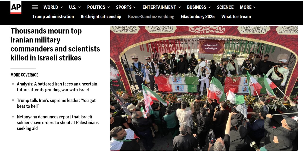 خبرگزاری آمریکایی آسوشیتدپرس اینطور نوشت: «هزاران نفر برای فرماندهان نظامی و دانشمندان کشته شده در حملات اسرائیل سوگواری کردند.»