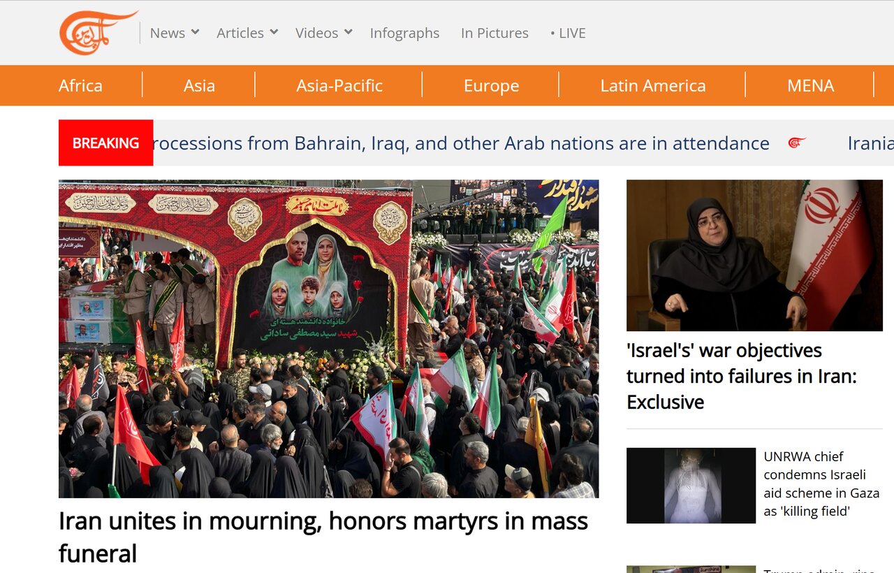 المیادین لبنان نوشت: «ملت ایران با اشک و غروری تزلزلناپذیر، در سوگ شهیدان، رهبران نظامی، دانشمندان و کودکان خود که در تجاوز اسرائیل کشته شدهاند، میایستد و در برابر تهدیدات خارجی متحد میماند.»