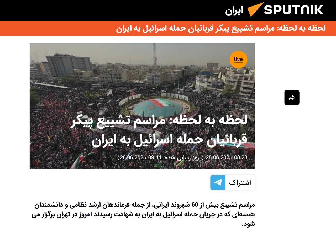 خبرگزاری روسی اسپوتنیک با پوشش لحظهای این مراسم نوشت: «مراسم تشییع بیش از ۶۰ شهروند ایرانی، از جمله فرماندهان ارشد نظامی و دانشمندان هستهای که در جریان حمله اسرائیل به ایران به شهادت رسیدند امروز در تهران برگزار میشود.»