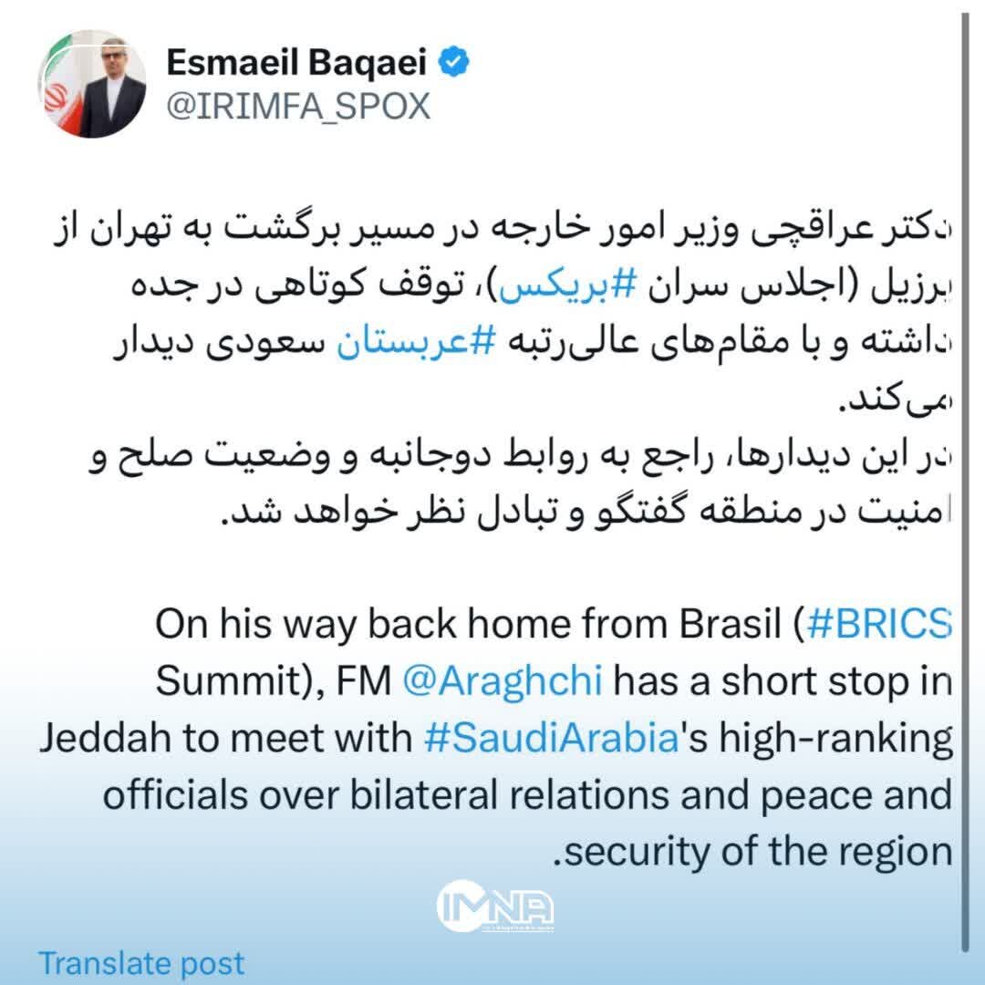 «دکتر عراقچی وزیر امور خارجه در مسیر بازگشت به تهران از برزیل (اجلاس سران بریکس) توقف کوتاهی در جده داشته و با مقامات عالی رتبه عربستان صعودی دیدار میکند.