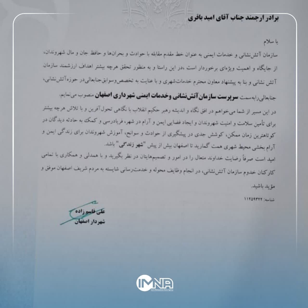 «سازمان آتش نشانی و خدمات ایمنی به عنوان خط مقدم مقابله با حوادث و بحرانها و حافظ جان و مال شهروندان از جایگاه و اهمیت ویژهای برخوردار است؛ در این راستا و به منظور تحقق هرچه بیشتر اهداف ارزشمند سازمان آتش نشانی و بنا به پیشنهاد معاون محترم خدمات شهری و با عنایت به تخصص و سوابق جنابعالی در حوزه آتشنشانی جنابعالی را به سمت «سرپرست سازمان آتشنشانی و خدمات ایمنی شهرداری اصفهان» منصوب مینمایم.