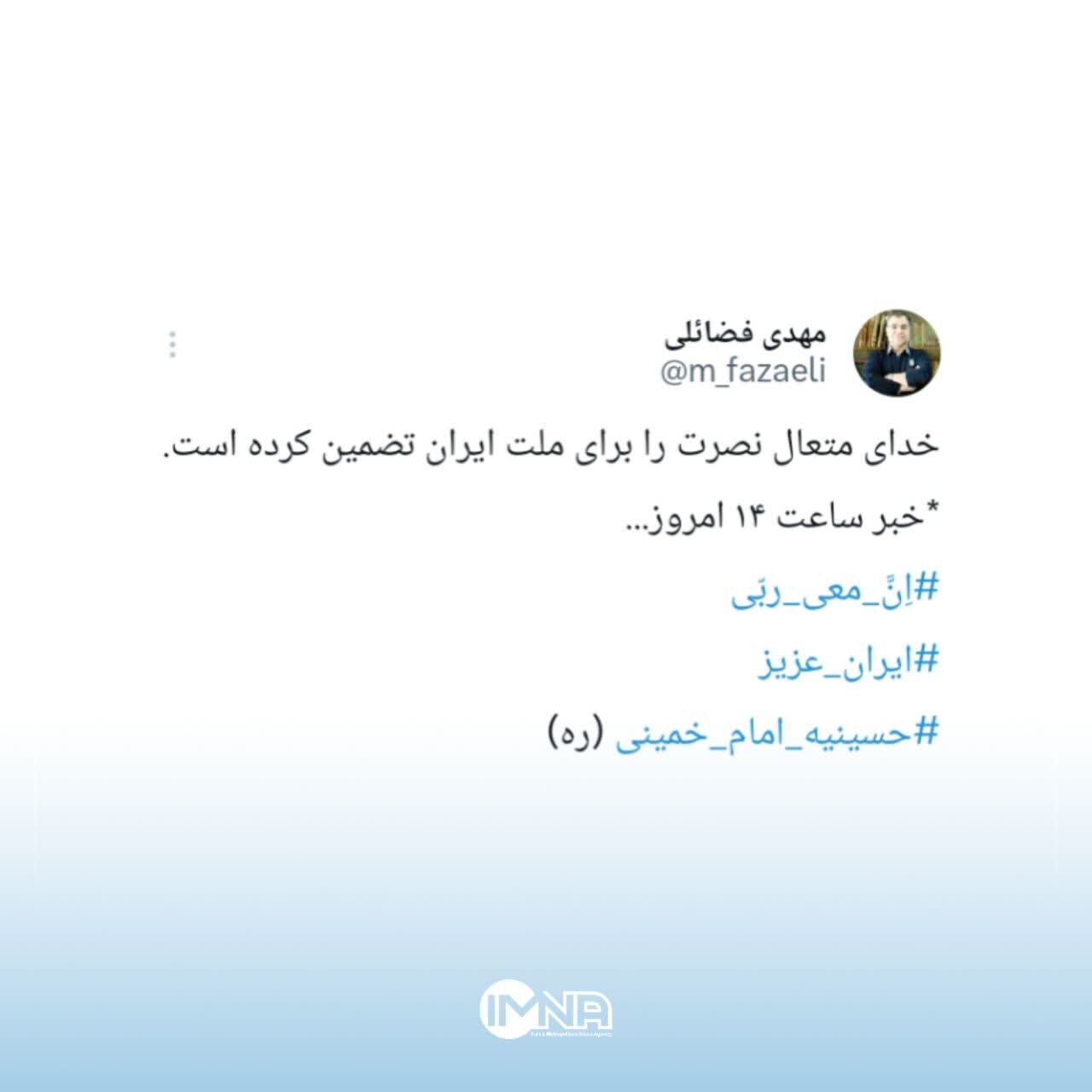 به گزارش خبرگزاری ایمنا، مهدی فضایلی در حساب کاربری خود در شبکه اجتماعی ایکس با استفاده از هشتگ «حسینیه امام خمینی (ره)»، نوشت: «خدای متعال نصرت را برای ملت ایران تضمین کرده است.