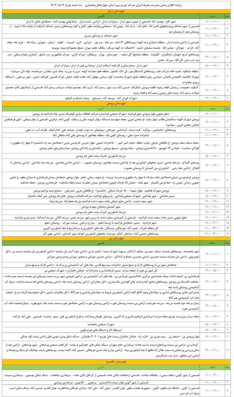 به گزارش خبرگزاری ایمنا از چهارمحال و بختیاری، شرکت توزیع برق استان چهارمحال و بختیاری جدول احتمالی خاموشیهای برق این استان را برای فردا _سهشنبه چهاردهم مرداد_ منتشر کرد.