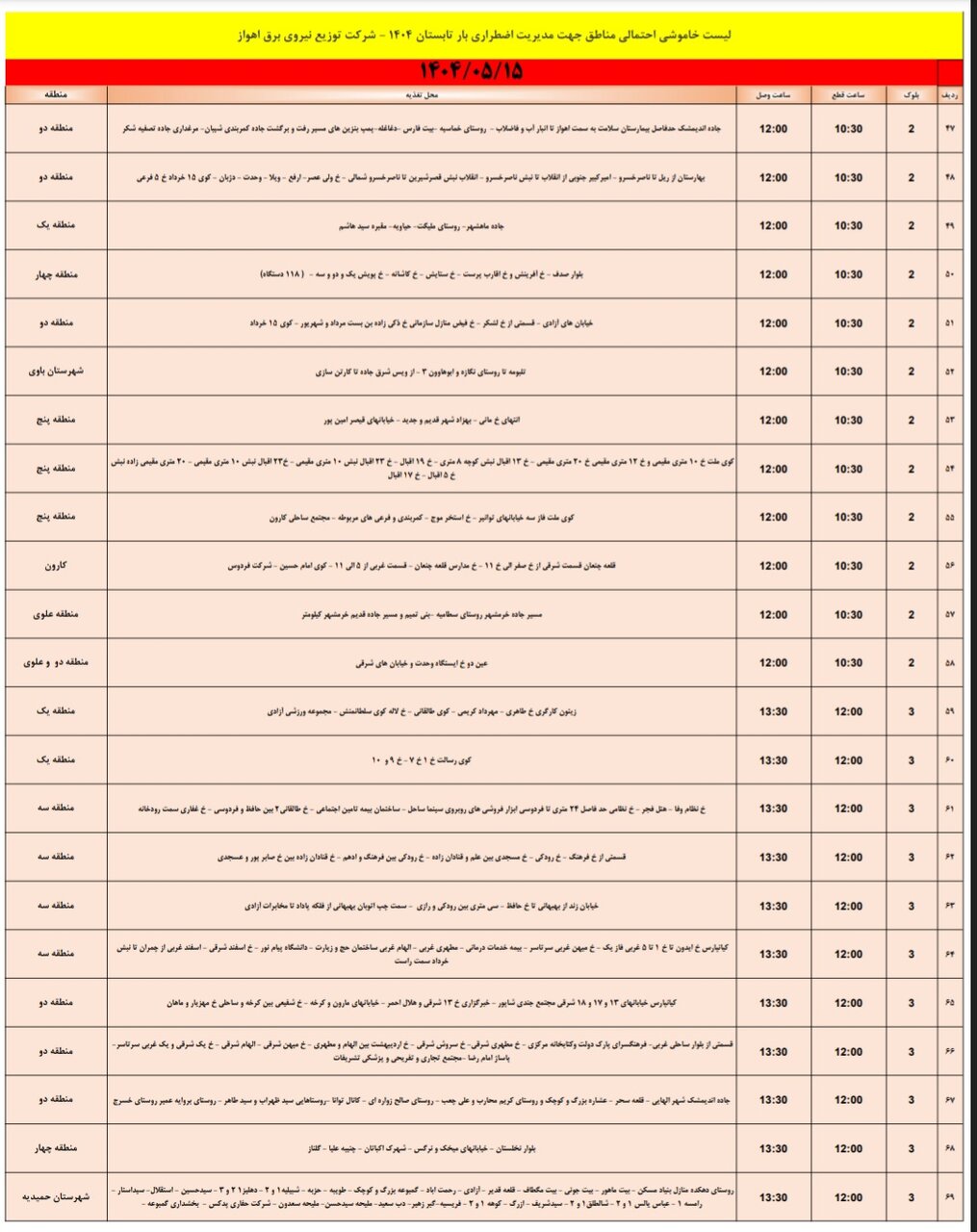 به گزارش خبرگزاری ایمنا از خوزستان، شرکت توزیع نیروی برق اهواز، جدول خاموشی برق مناطق مختلف اهواز برای _چهارشنبه پانزدهم مرداد_ را اعلام کرد.