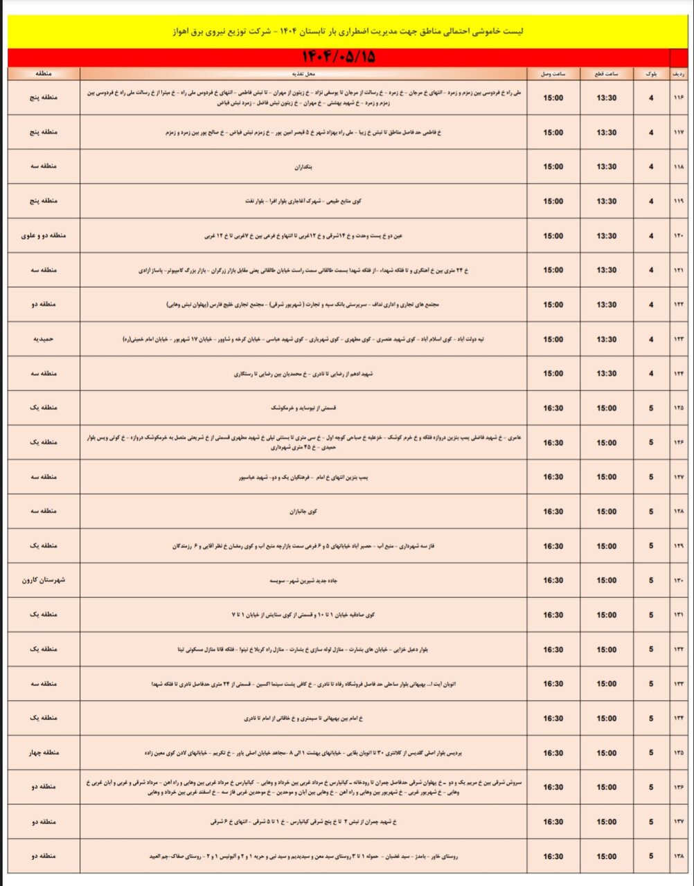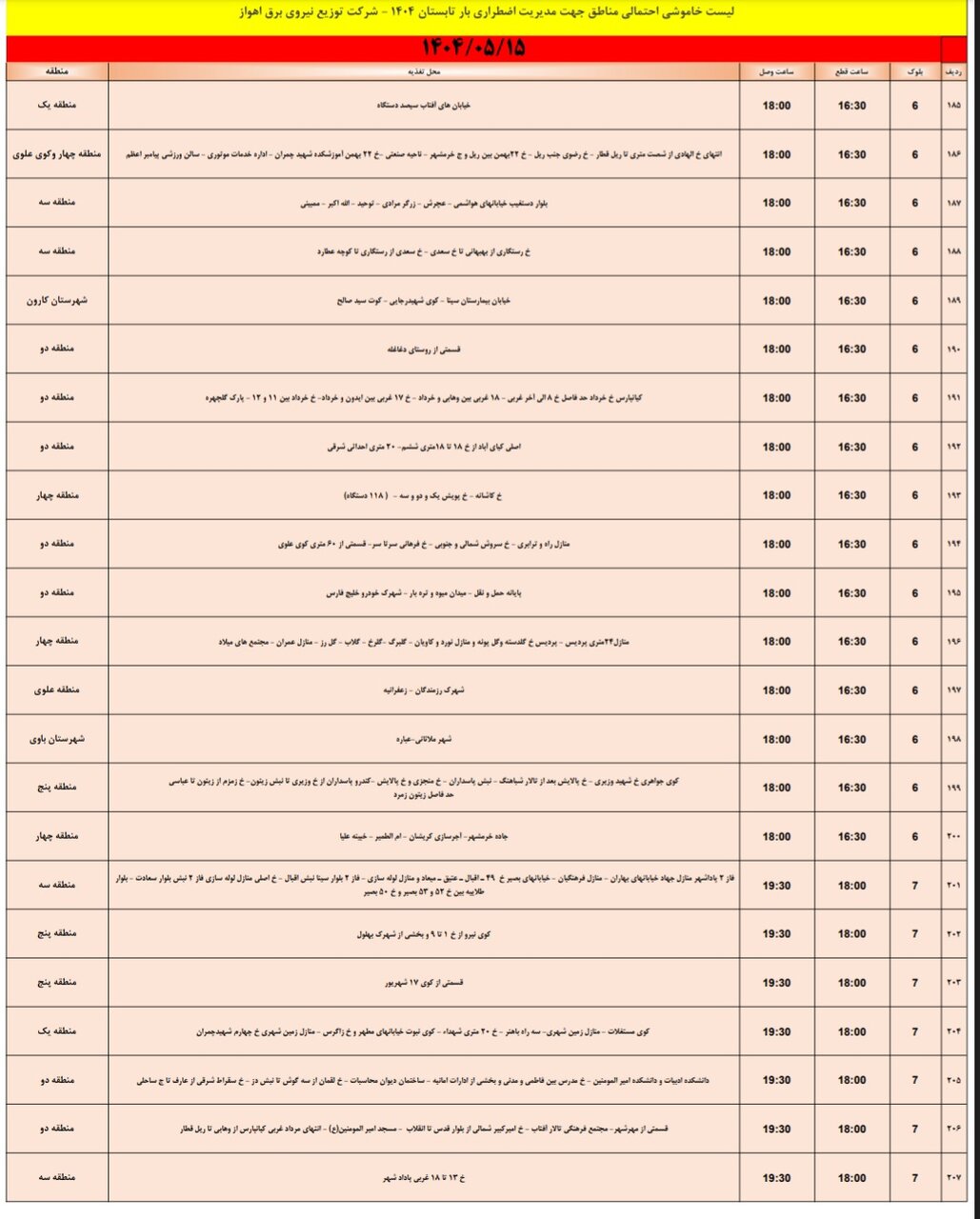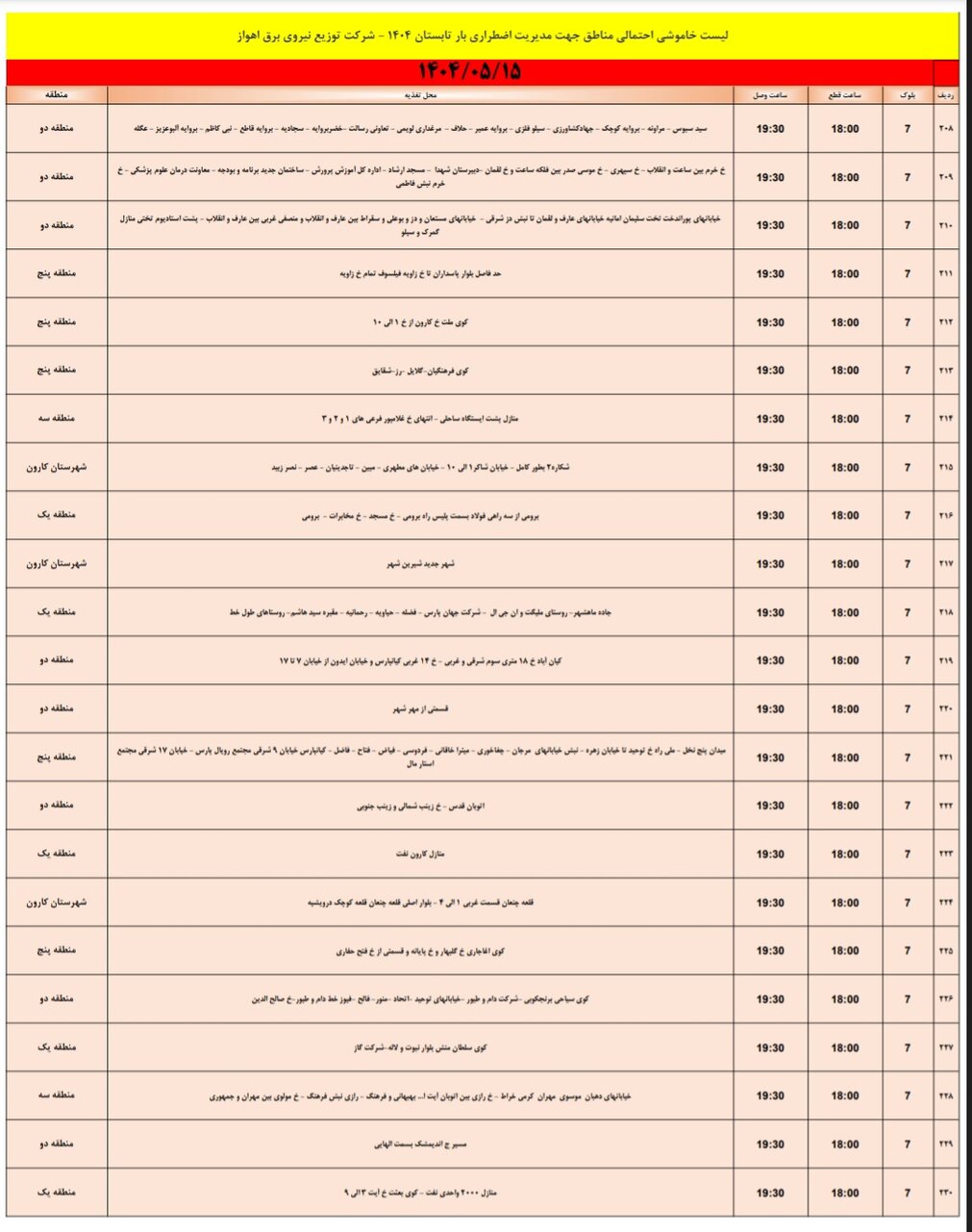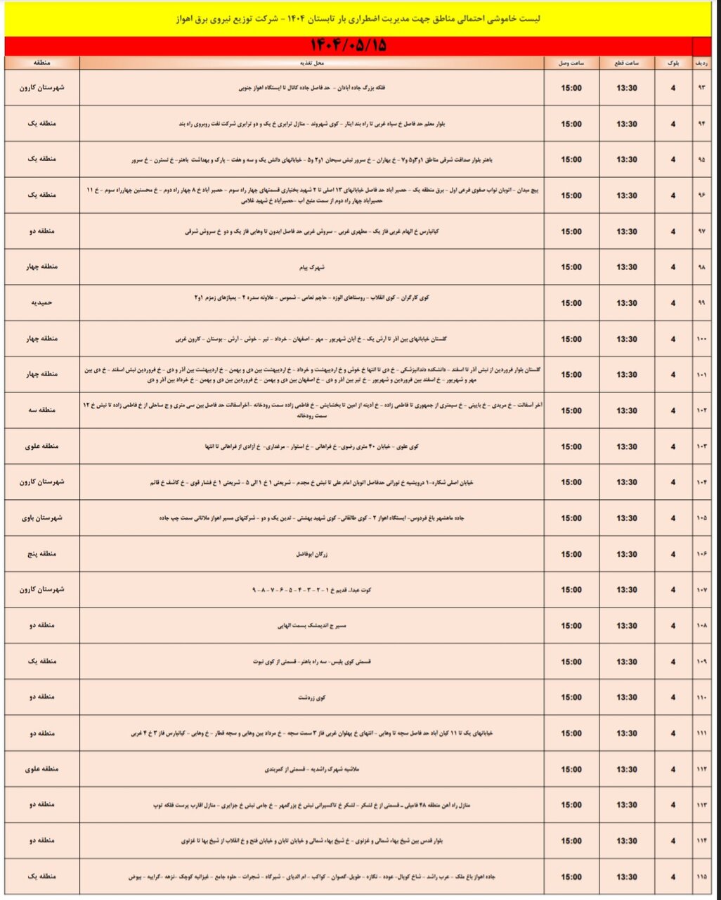 شرکت توزیع نیروی برق اهواز جدول خاموشی برق اهواز برای امروز (چهارشنبه) را اعلام کرد.