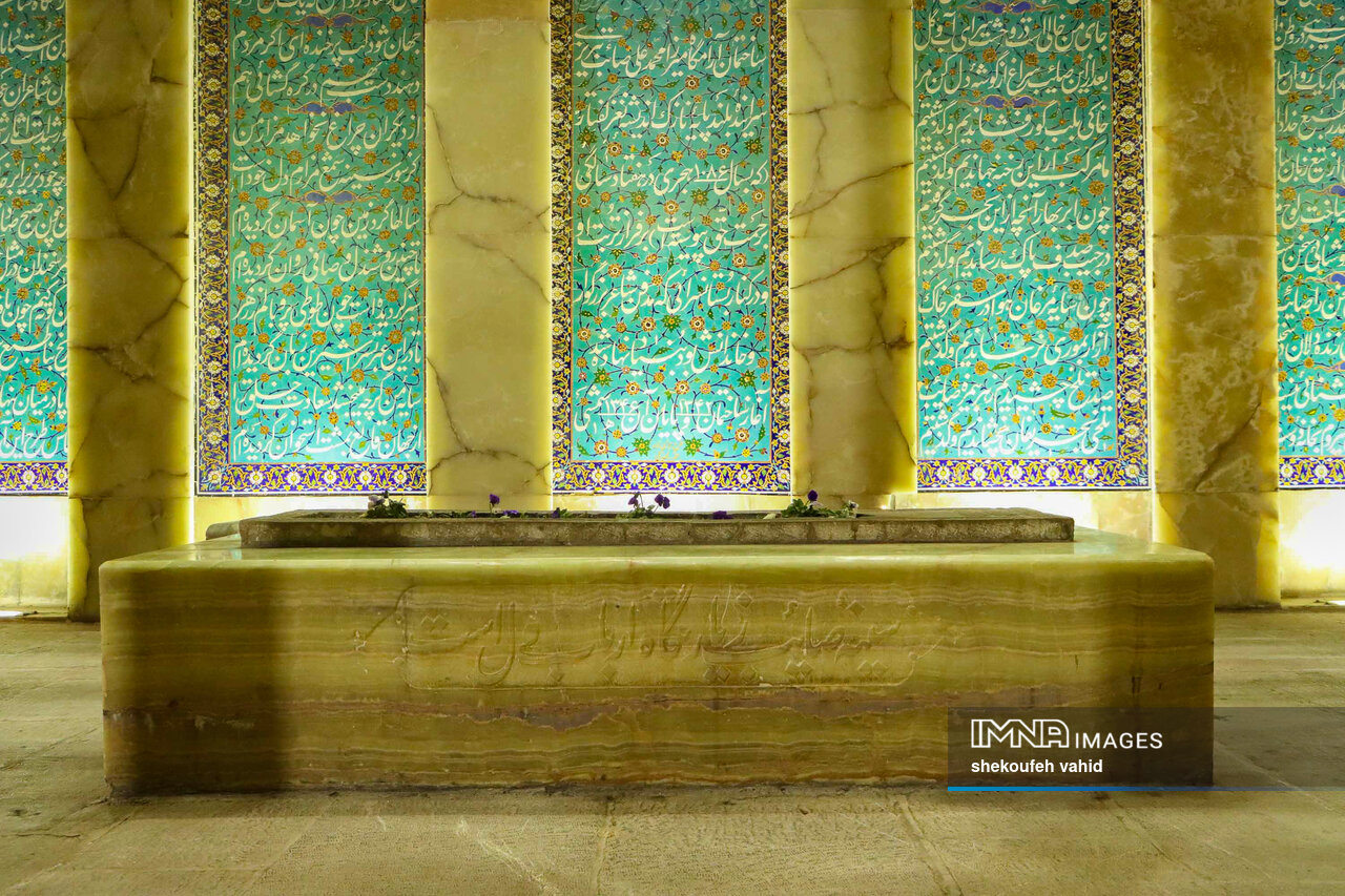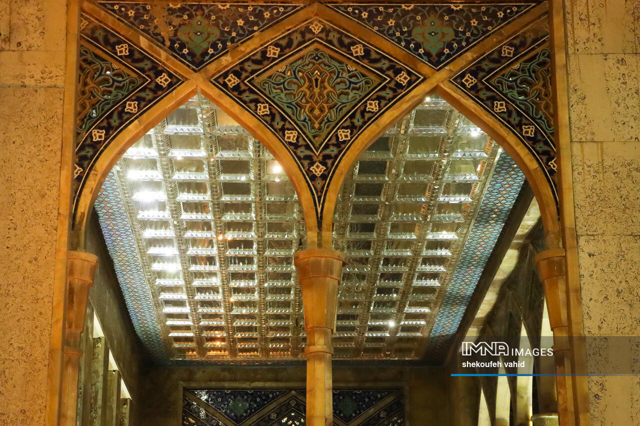 ایوان بلند آرامگاه، با ده پله سنگی، نخستین فراخوان بازدیدکننده است؛ دعوتی به ورود در فضای شاعرانه و تأمل‌آمیز. سقف ایوان با آینه‌کاری شطرنجی و سرستون‌های مزین به قوس‌های جناقی، شکوه و ظرافت معماری صفوی را در برابر چشم‌ها می‌گسترد. روبروی ایوان، حوض و آبنمایی یادآور حوض بزرگ چهل‌ستون، آرامشی شاعرانه و نغمه‌ای بی‌صدا به فضا می‌افزاید.