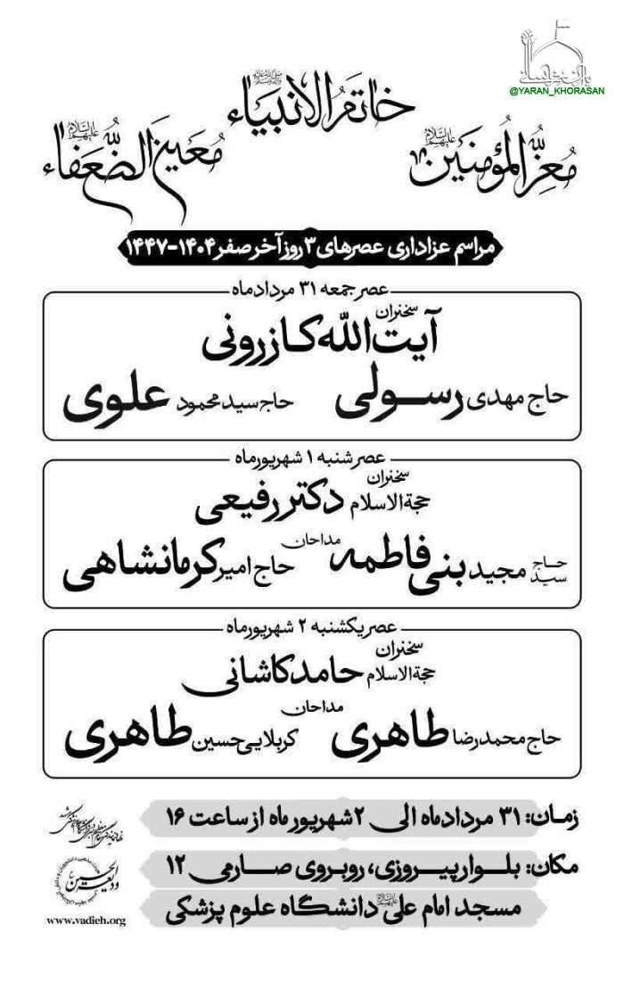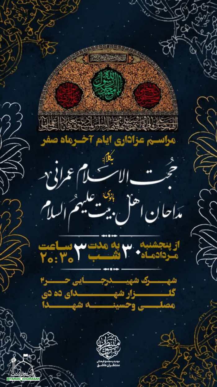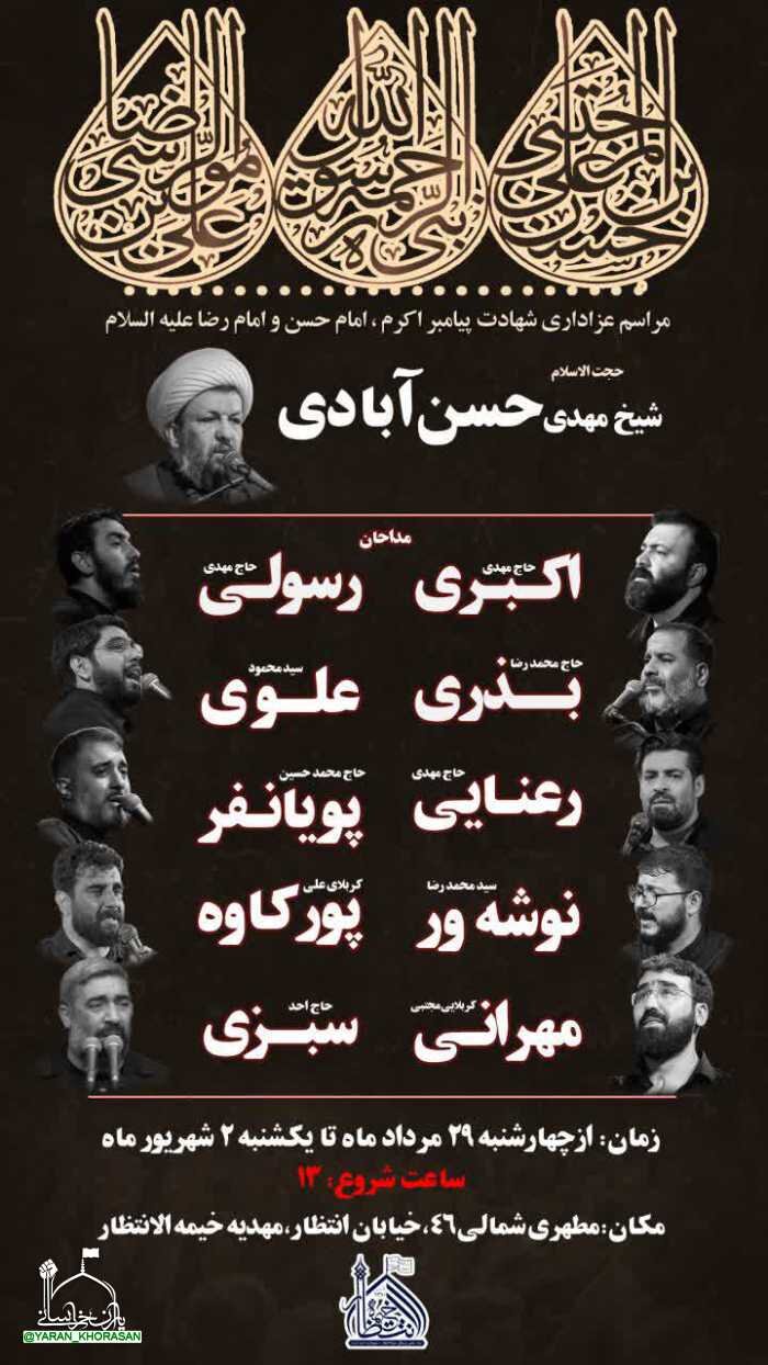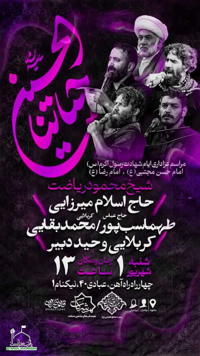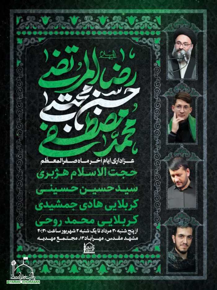 به گزارش خبرگزاری ایمنا از خراسان رضوی، در دهه پایانی صفر به ویژه سه روز آخر این ماه، هیئتهای مختلفی در سطح شهر مشهد مقدس مراسمهای عزاداری سالروز رحلت رسول اکرم (ص) و سالروز شهادت امام حسن مجتبی (ع) و نیز سالروز شهادت امام علیبنموسیالرضا (ع) را بر پا میکنند که در این گزارش برنامههای این هیئتها آمده است.