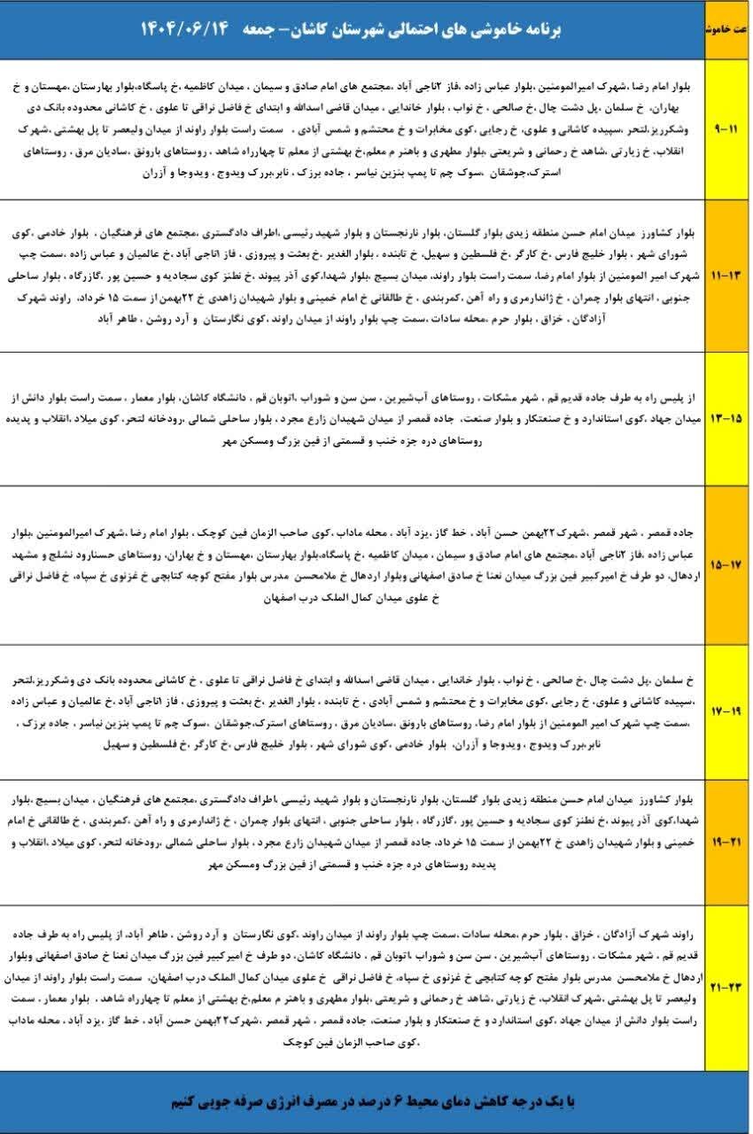 جدول قطعی برق کاشان امروز ۱۴ شهریور ۱۴۰۴