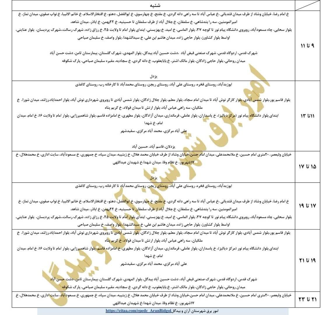 جدول قطعی برق آران و بیدگل ۱۵ شهریور ۱۴۰۴