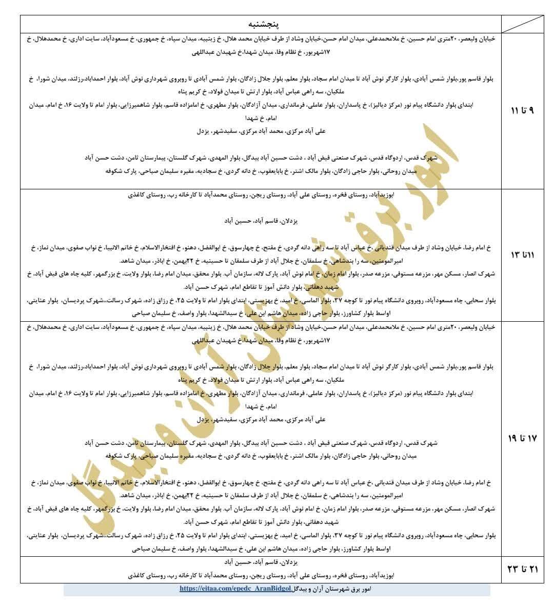 جدول قطعی برق آران و بیدگل ۲۰ شهریور ۱۴۰۴