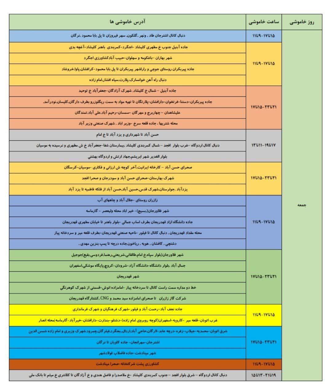 جدول قطعی برق شاهین شهر جمعه ۲۱ شهریور ۱۴۰۴