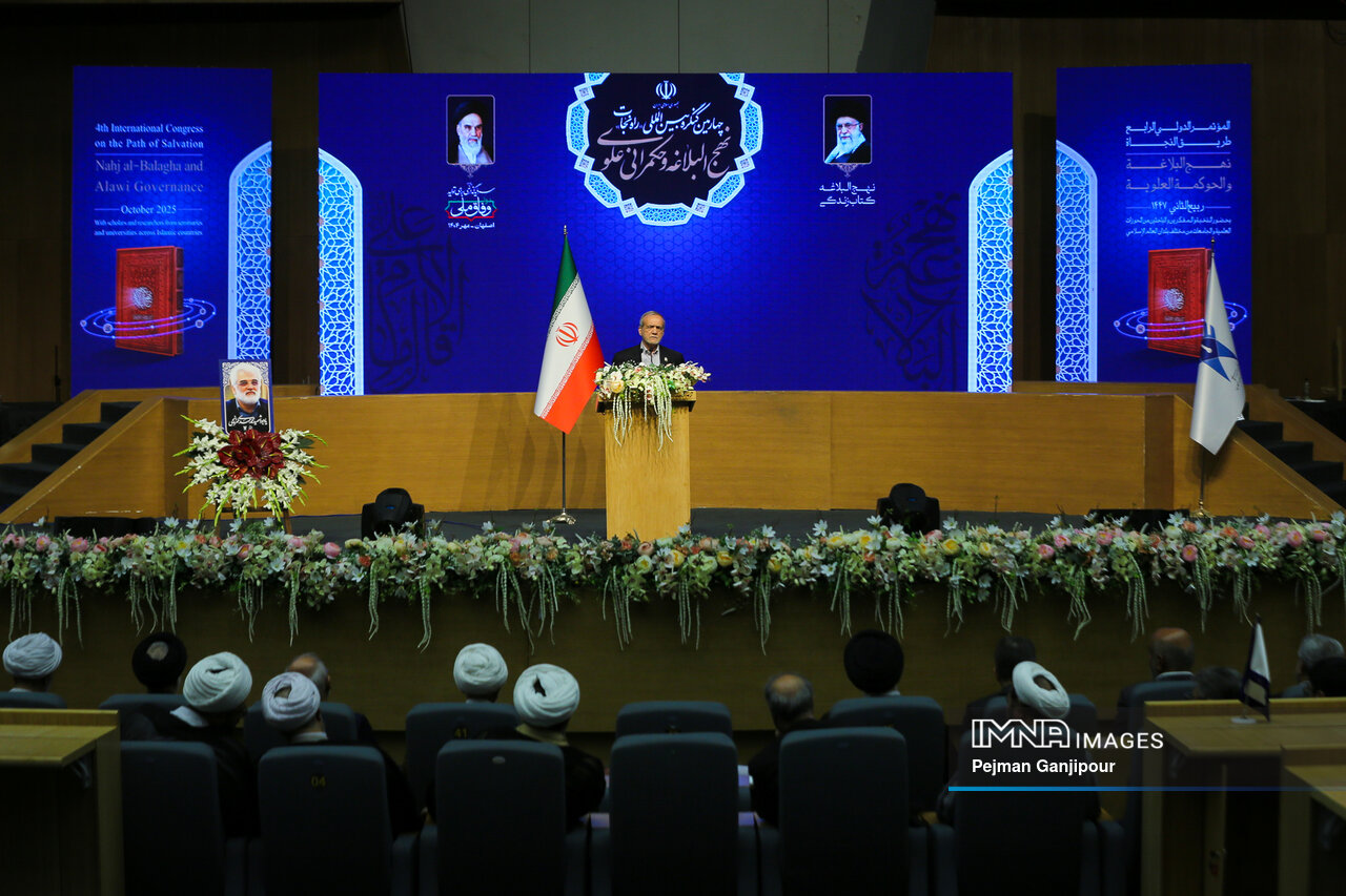 مسعود پزشکیان رئیس جمهور چهارمین و آخرین سخنرانی این همایش بود. وی در این همایش اظهار کرد: نهجالبلاغه نقشه راه حکمرانی عادلانه است و باید الگوی حکومت امیرالمؤمنین (ع) را در مدیریت کشور اجرا کنیم. وی تأکید کرد: امروز اختیارات و مسئولیتها در نظام مدیریتی تکهتکه شده و همین باعث ضعف پاسخگویی و عدالت شده است.