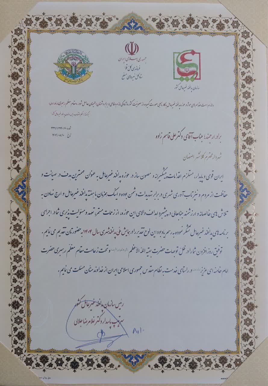 ایران قوی و پایدار، مستلزم اقدامات پیشگیرانه و مصونساز در حوزه پدافند غیرعامل بهعنوان مهمترین هدف در صیانت و حفاظت از مردم و نیز تابآوری شهری در برابر تهدیدات دشمن بوده و اینک همزمان با هفته پدافند غیرعامل و ارج نهادن به تلاشهای خالصانه و ارزشمند جنابعالی در پیشبرد اهداف والای این حوزه، از زحمات مستمر، تعهد و مسئولیتپذیری شما در اجرای برنامههای پدافند غیرعامل تشکر نموده، به رسم یادبود این لوح تقدیر را در همایش ملی پدافند شهری سال ۱۴۰۴ به حضورتان تقدیم مینمایم.