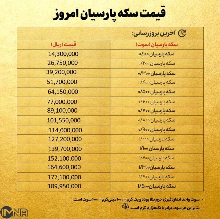 به گزارش خبرگزاری ایمنا، قیمت سکه پارسیان امروز _شنبه پانزدهم آذر _ در انواع سوت با عیار ۷۵۰ را در جدول زیر مشاهده کنید.