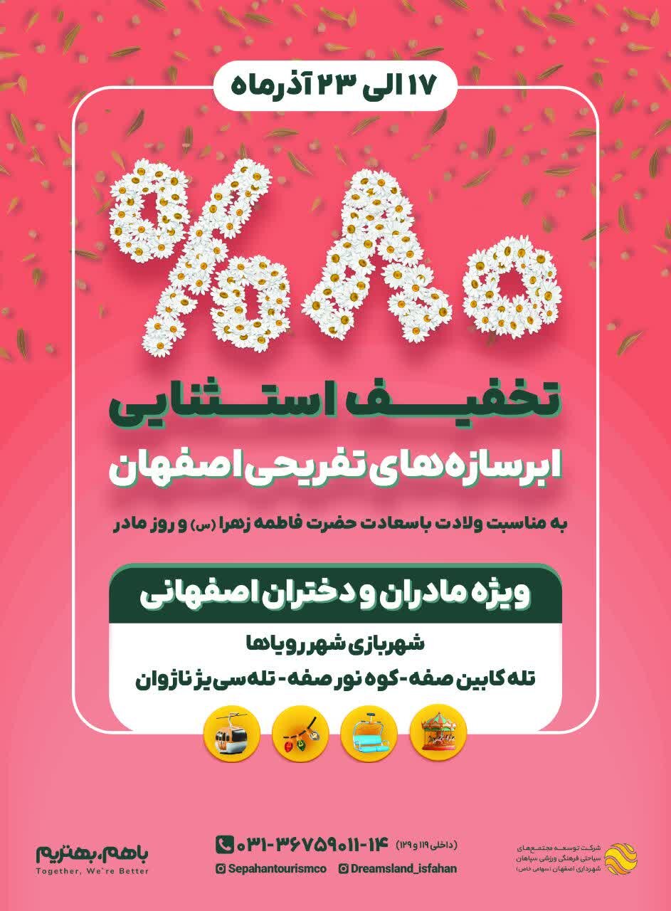 وی افزود: سال جاری نیز با همراهی مدیریت محترم شهری نسبت به ارائه خدمات ویژه به بانوان و مادران نصف جهان در پهنه ابرسازه‌های تفریحی اصفهان با تخفیف ۸۰ درصدی میزبان آن‌ها در تله کابین صفه، تله‌سیژ ناژوان، کوه نور صفه و شهربازی شهر رویاها خواهیم بود.