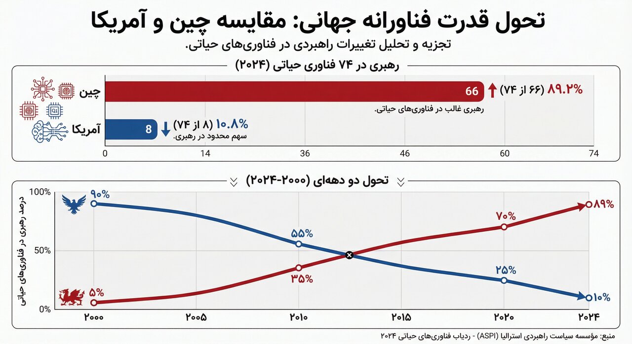 به گزارش خبرگزاری ایمنا و به نقل از نیچر، مؤسسه سیاست راهبردی استرالیا (ASPI) در گزارش تحقیقی خود به نام «ردیاب فناوری‌های حیاتی»، کشف کرده است که جمهوری خلق چین در حوزه پژوهش‌های علمی مربوط به ۶۶ مورد از ۷۴ فناوری حیاتی و تعیین‌کننده جهان، رتبه نخست را به خود اختصاص داده است. این یافته نشان‌دهنده یک چرخش تاریخی و کاملاً بی‌سابقه در معادلات فناورانه جهانی است، فناوری‌های مورد بررسی در این گزارش، فناوری‌هایی هستند که نقشی تعیین‌کننده و اساسی در تقویت یا تهدید منافع ملی و استراتژیک کشورها ایفا می‌کنند. این فناوری‌ها طیف وسیعی از حوزه‌های حساس و مهم را پوشش می‌دهند؛ از انرژی هسته‌ای و بیوتکنولوژی مصنوعی، گرفته تا فناوری ماهواره‌های کوچک، رایانش ابری، رایانش لبه‌ای و سیستم‌های رایانش پیشرفته که هر کدام نقش محوری در تعیین آینده صنایع و امنیت ملل ایفا می‌کنند.
