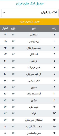جدول لیگ برتر فوتبال فصل ۱۴۰۵-۱۴۰۴ (جام خلیج فارس) هفته چهاردهم