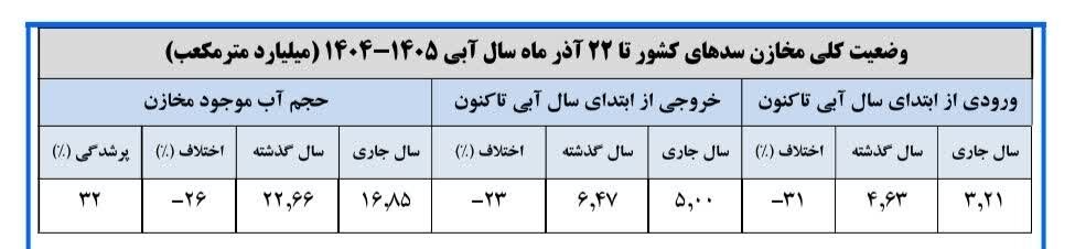 به گزارش خبرگزاری ایمنا، بر اساس آخرین آمار اعلام‌شده از سوی دفتر مطالعات پایه منابع آب، از ابتدای سال آبی تا بیست‌ودوم آذر ۱۴۰۴ از مجموع ۶۶ سد، موجودی مخزن ۶۵ سد در کشور کاهش پیدا کرده است.
