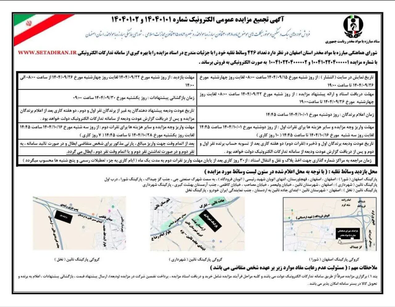 شورای هماهنگی مبارزه با مواد مخدر استان اصفهان در نظر دارد در اجرای مقررات و ضوابط قانونی، تعداد ۴۲۶ دستگاه انواع وسایط نقلیه توقیفی و ضبطی شامل خودروهای سبک و سنگین و موتورسیکلت و سایر وسایط نقلیه را از طریق مزایده عمومی و به بالاترین قیمت پیشنهادی به فروش برساند.