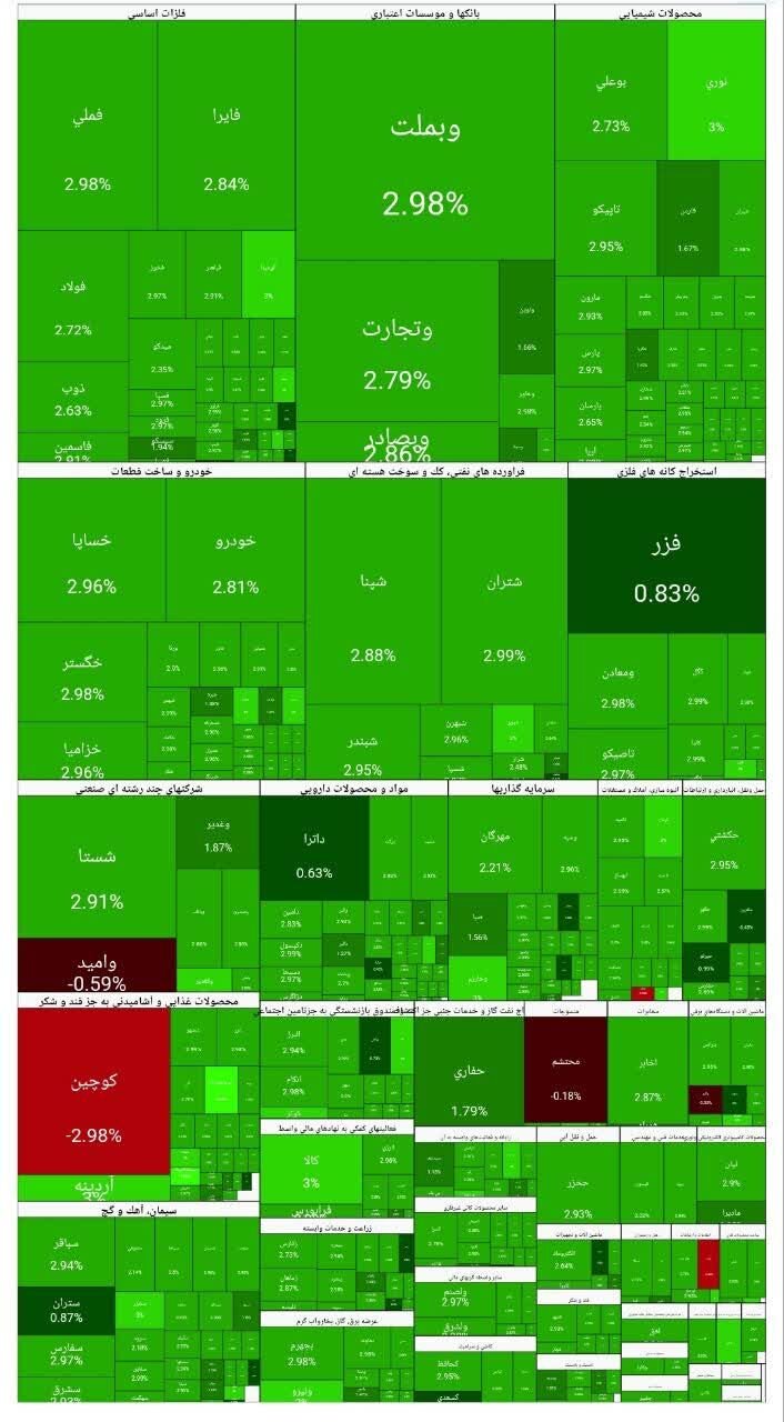 ارزش کل بازار بورس نیز بالغ‌بر ۱۱۴,۷۲۵,۵۱۵.۰۳۳ میلیارد ریال شد.