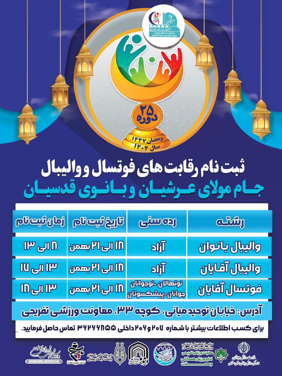 معاون ورزشی و تفریحی سازمان فرهنگی، اجتماعی و ورزشی شهرداری اصفهان از آغاز ثبت‌نام بیست‌وسومین دوره مسابقات فوتسال و والیبال جام مولای عرشیان و بانوی قدسیان خبر داد و هدف اصلی این رویداد را ترویج نشاط، ورزش و سبک زندگی سالم در میان شهروندان عنوان کرد.