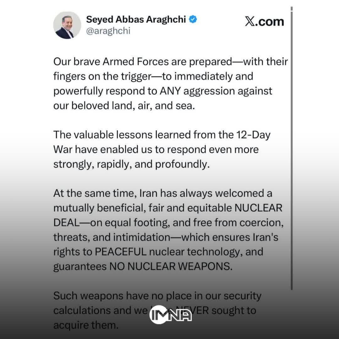 به گزارش خبرگزاری ایمنا، سید عباس عراقچی امشب _چهارشنبه شب هشتم بهمن_ در شبکه ایکس و در واکنش به تهدید اخیر رئیس جمهور آمریکا عنوان کرد: درسهای ارزشمند آموختهشده از جنگ ۱۲روزه این توان را به ما داده است که اکنون با قدرت، سرعت و شدت بیشتری واکنش نشان دهیم.