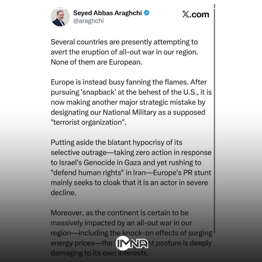 به گزارش خبرگزاری ایمنا، سیدعباس عراقچی در شبکه اجتماعی ایکس به اقدام اتحادیه اروپا علیه سپاه پاسداران انقلاب اسلامی واکنش نشان داد و نوشت: «در حال حاضر چندین کشور تلاش می کنند از شعلهور شدن یک جنگ تمامعیار در منطقه ما جلوگیری کنند. جالب است که هیچیک از این کشورها اروپایی نیستند.