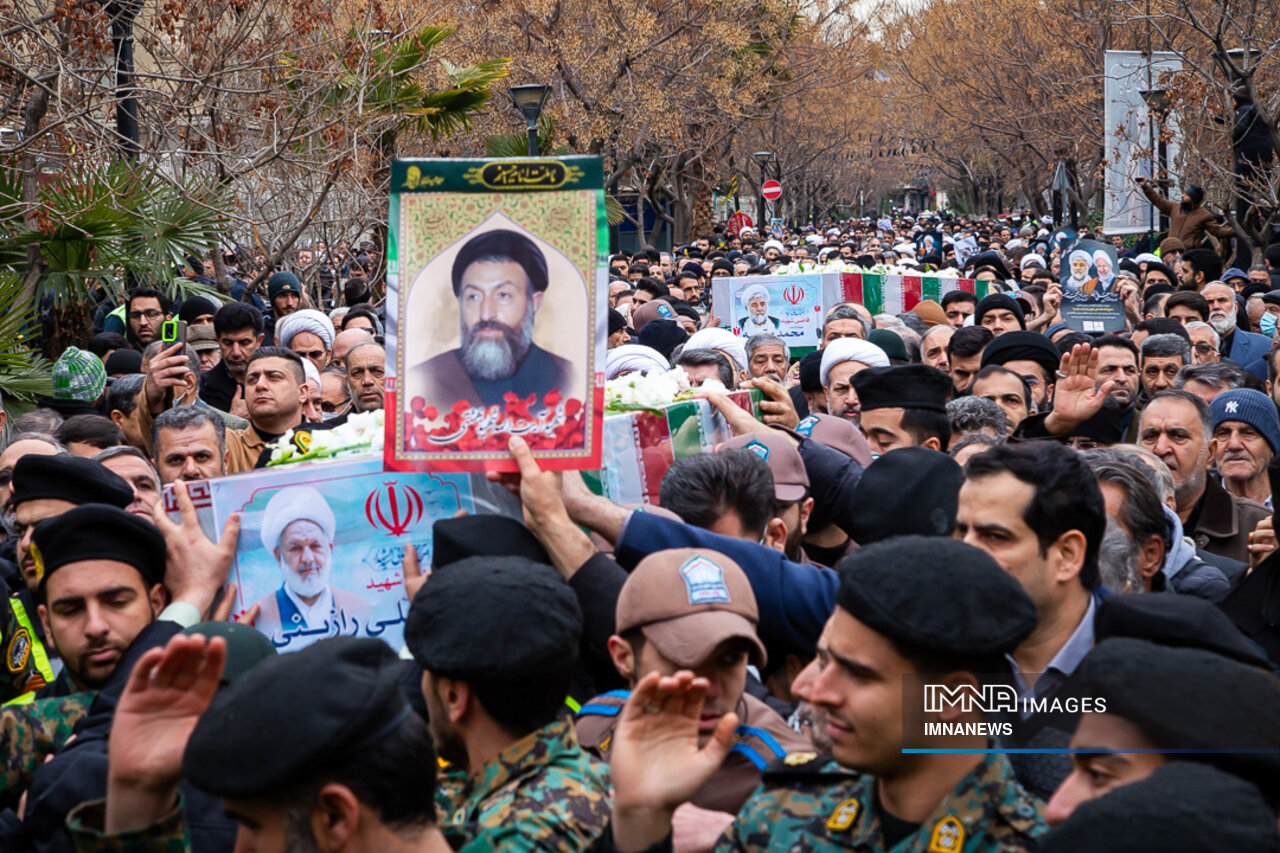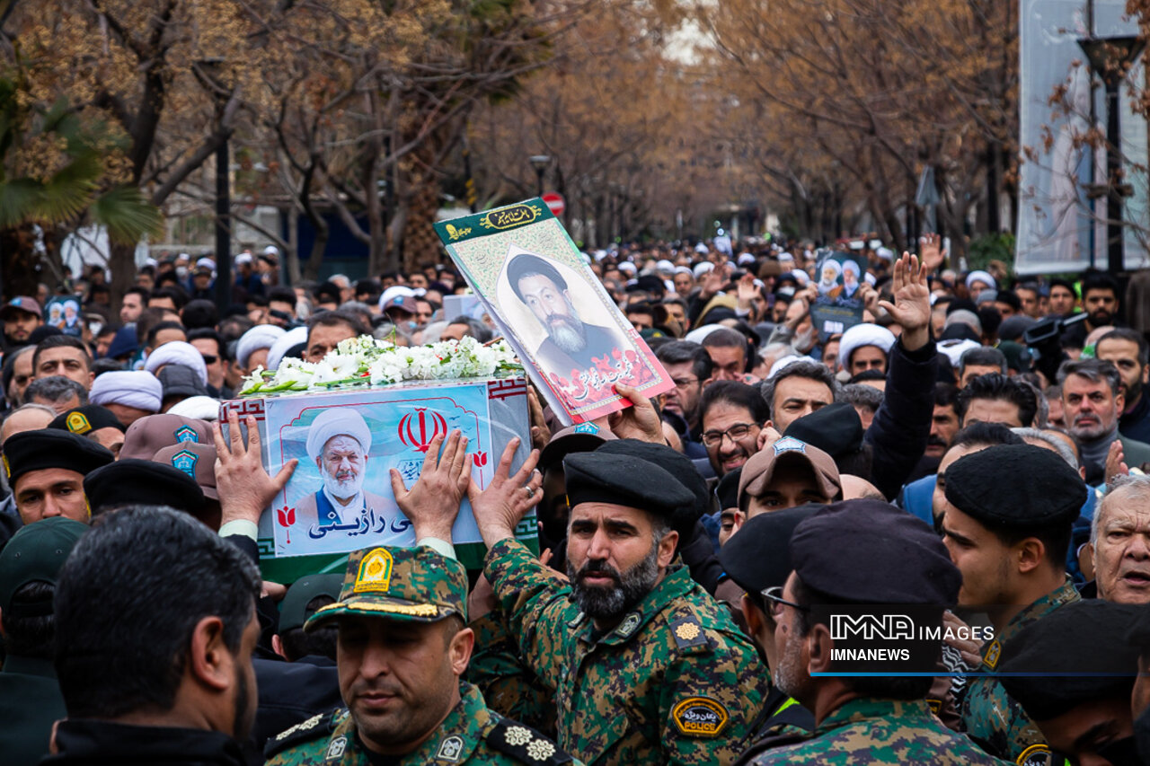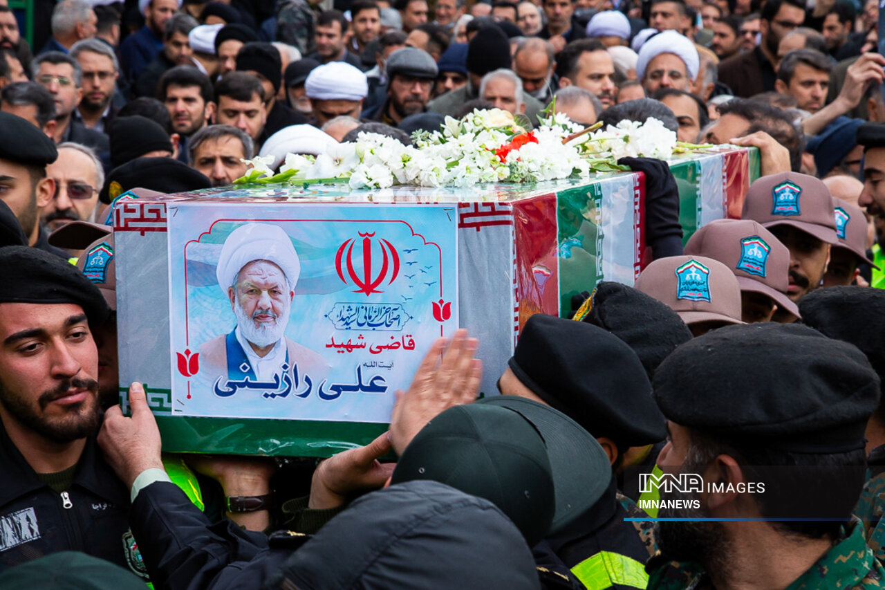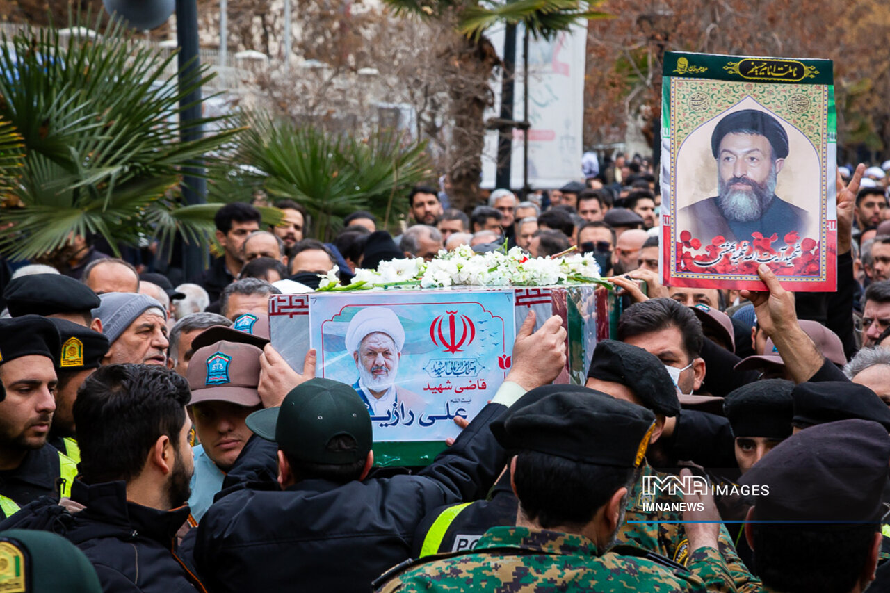 پیکر مطهر شهید حجت الاسلام علی رازینی و شهید حجت الاسلام محمد مقیسه دو قاضی شجاع و پرسابقه در مبارزه با جرایم علیه امنیت ملی، جاسوسها و تروریسم صبح امروز _دوشنبه یکم بهمن_ از ضلع شرقی دیوان عالی کشور واقع در خیابان داور به سمت قبور مطهر شهدای گمنام میدان ارک تشییع شد.