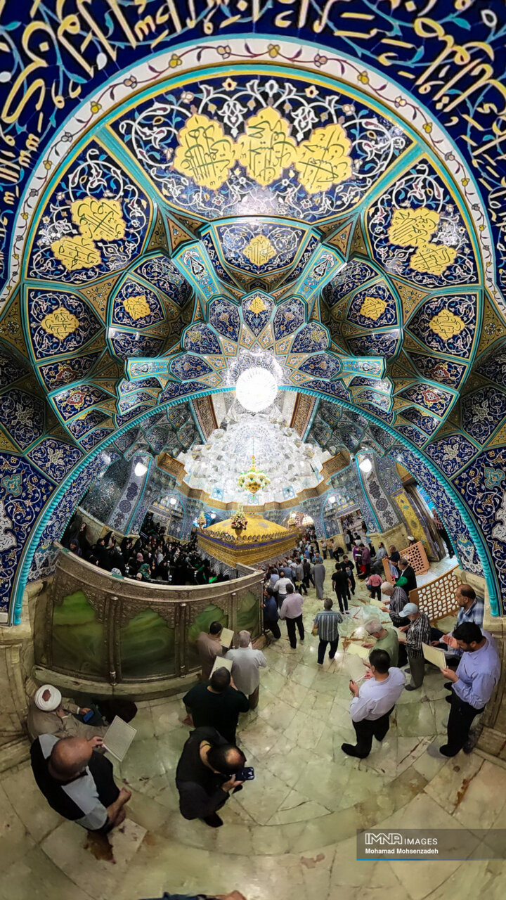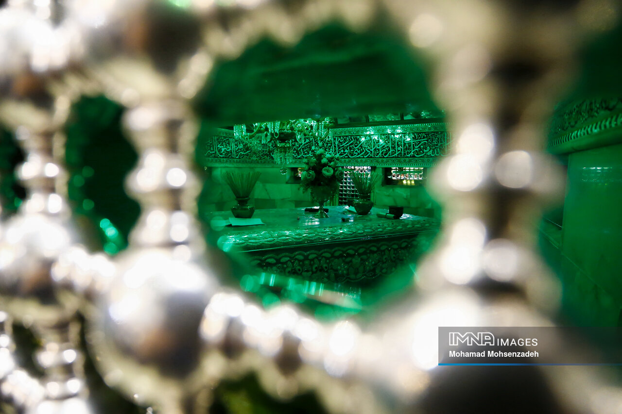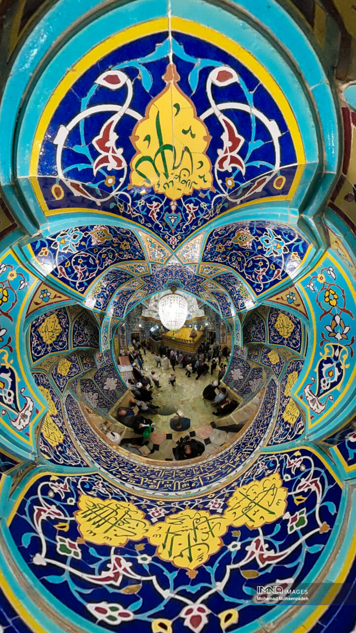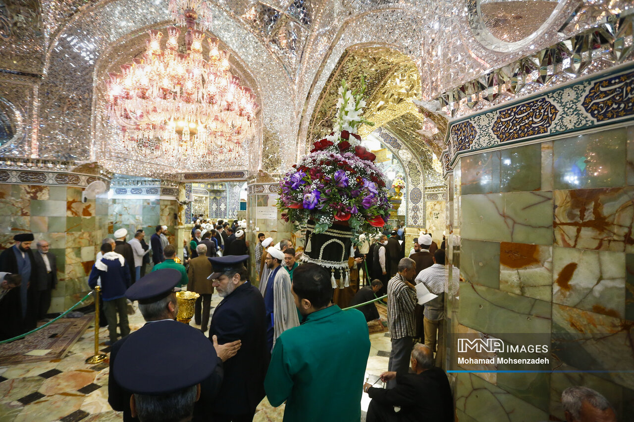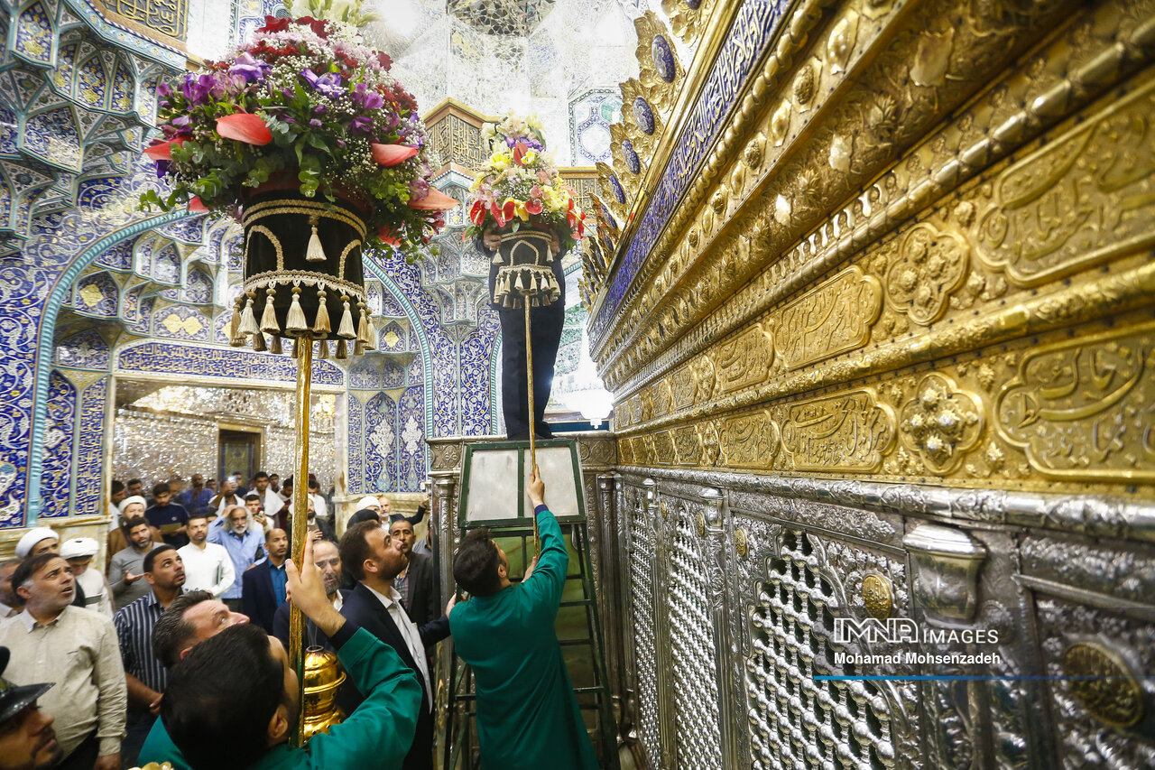 زمانی که به دستور «امیر مظفر احمد بن اسماعیل» بزرگ خاندان آل مظفر، بزرگترین استاد کاشیساز آن زمان «محمد بن ابی طاهر کاشی قمی» کار ساخت و پرداخت کاشیهای متنوع مرقد را آغاز کرد و بعد از هشت سال، با آماده شدن کاشیها، آنها کار گذاشته شدند. در سال ۹۶۵ هجری شاه طهماسب صفوی، در چهار طرف مرقد ضریحی آجری آراسته به کاشیهای هفت رنگ و کتیبههای معرق بنا کرد و در اطراف آن منافذی قرار گرفت تا هم مرقد دیده شود و هم زائران نذورات خود را داخل ضریح بریزند. پس از آن در سال ۱۲۳۰ قمری فتحعلی شاه همان ضریح را نقرهپوش کرد، ۵۰ سال بعد و زمانی که ضریح به مرور زمان فرسوده شد، در سال ۱۲۸۰ شمسی ضریحی که از نقره ضریح سابق و نقرههای موجود در خزانه ساخته شده بود، به جای آن نصب شد.