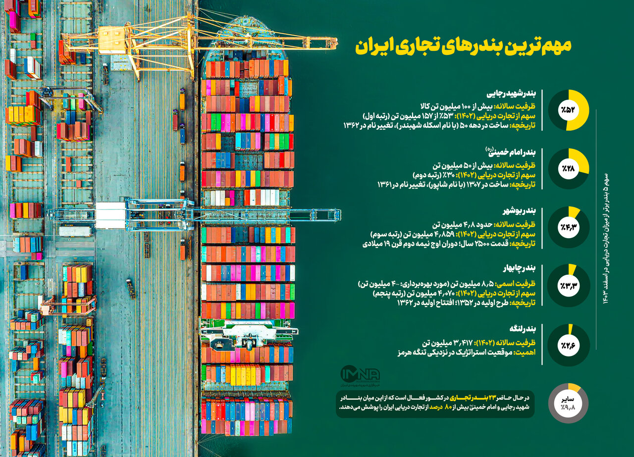 براساس دادههای سازمان بنادر و دریانوردی کشور در سال ۱۴۰۳ حدود ۸۰ درصد از تخلیه و بارگیری کالا در ایران مربوط به بندر شهید رجایی و امام خمینی(ره) بوده است؛ در این اینفوگرافی به بررسی مهمترین بندرهای کشور پرداخته شده است.