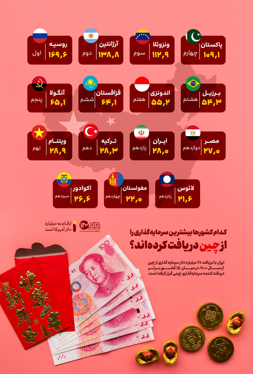 ایران با دریافت ۲۸ میلیارد دلار سرمایهگذاری از چین از سال ۲۰۰۰ در میان ۱۵ کشور برتر دریافت کننده سرمایهگذاری چینی قرار گرفته است؛ در این اینفوگرافی به بررسی مهمترین کشورهایی که بیشترین سرمایه را از چین جذب کردهاند، پرداخته شده است.