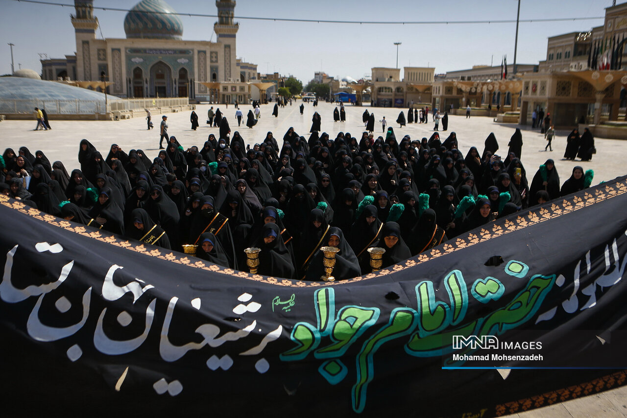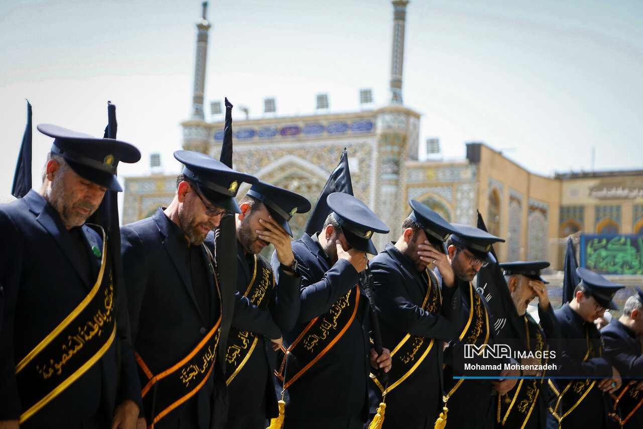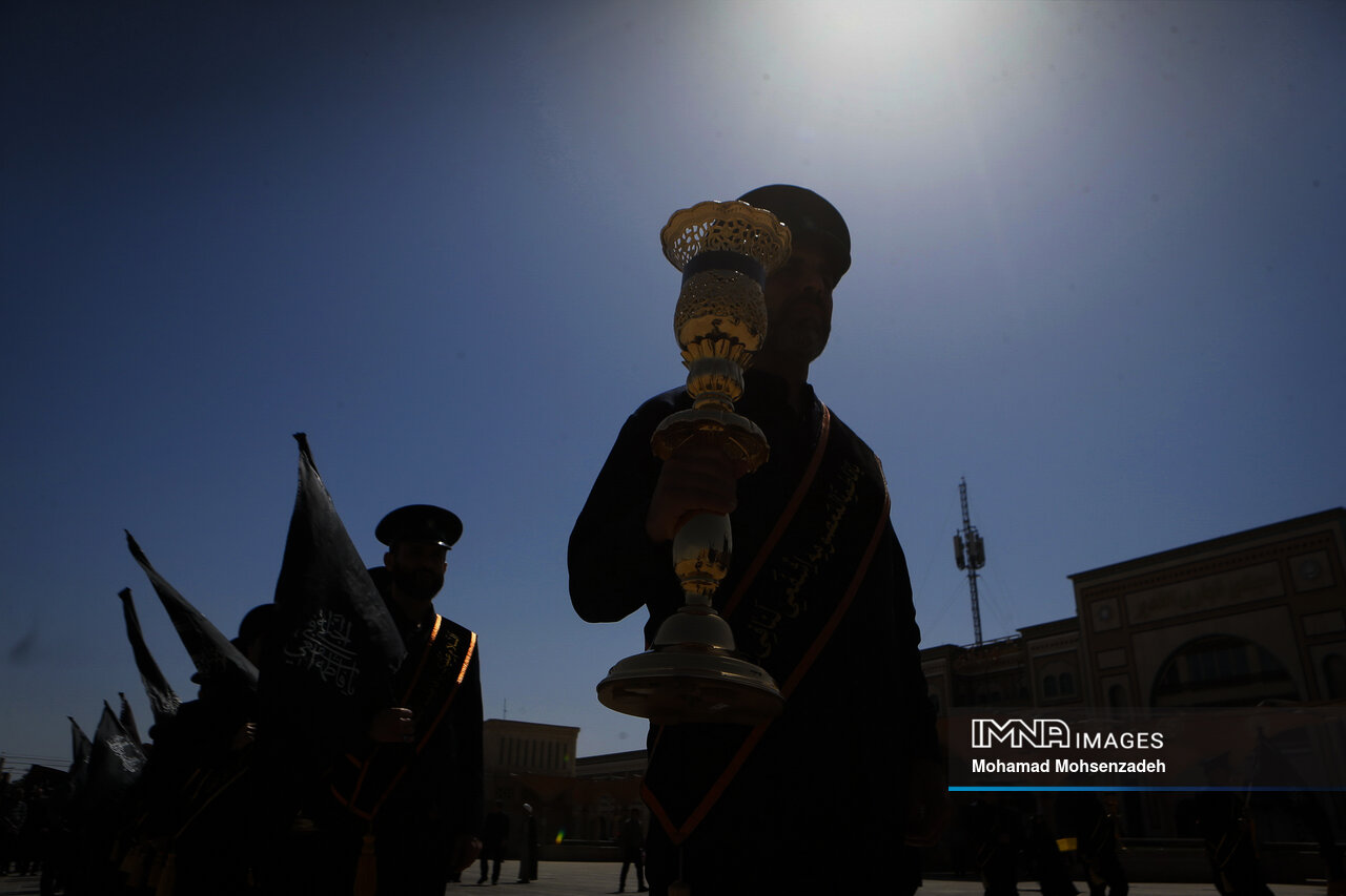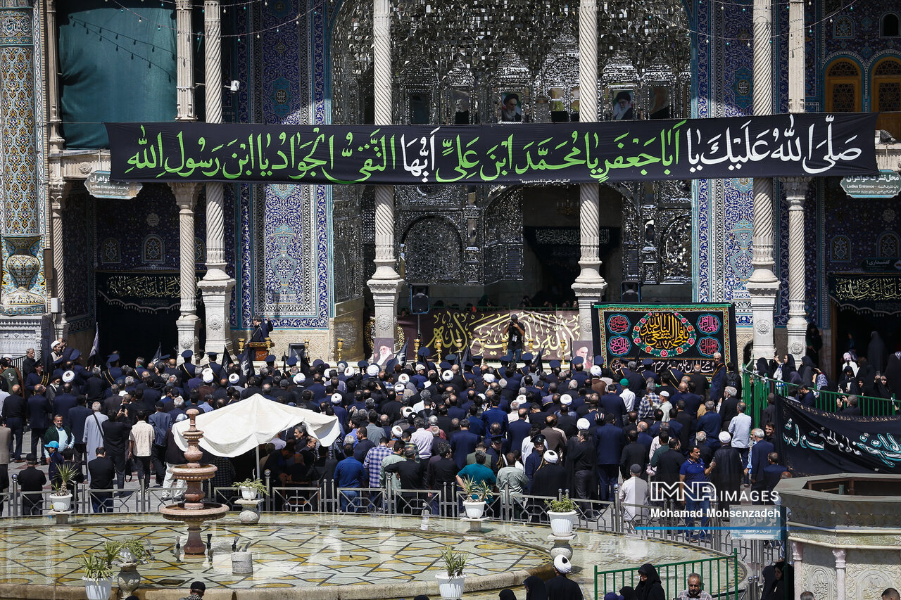 همزمان با روز شهادت امام محمد تقی جوادالائمه(ع)، خادمان حرم کریمه اهل بیت(ع) از مسجد امام حسن عسکری(ع) برای عرض تسلیت به سمت حرم حضرت فاطمه معصومه(س) حرکت کردند و در صحن امام رضا(ع) به عزاداری پرداختند.