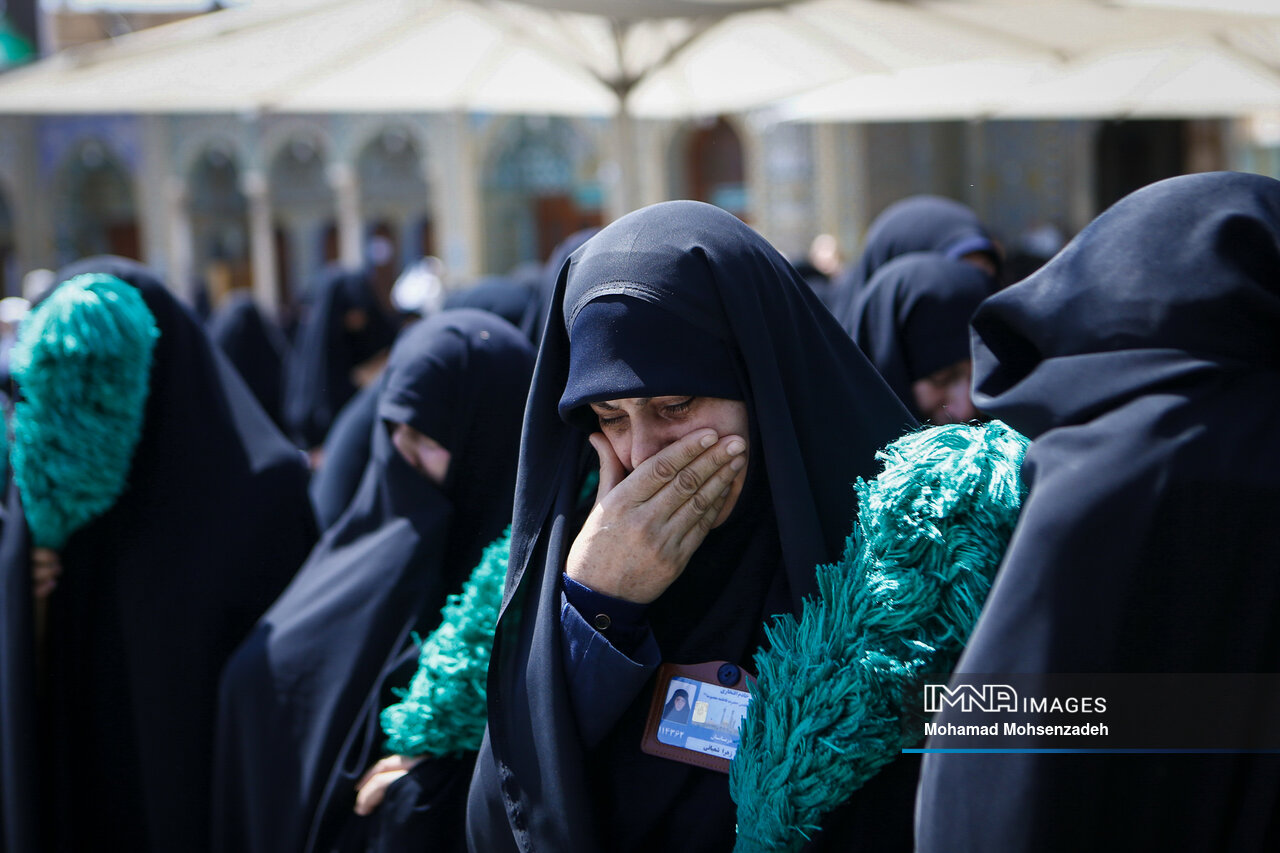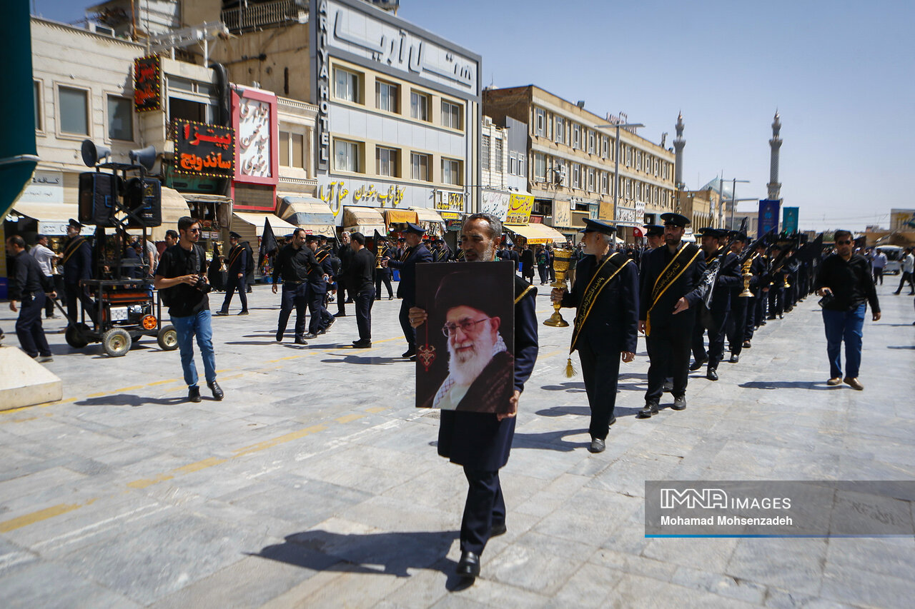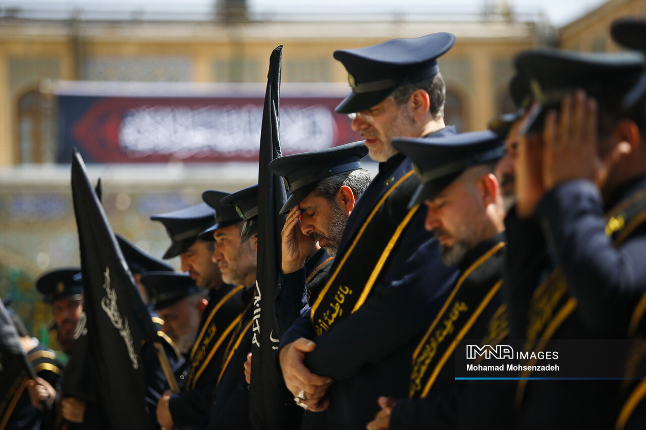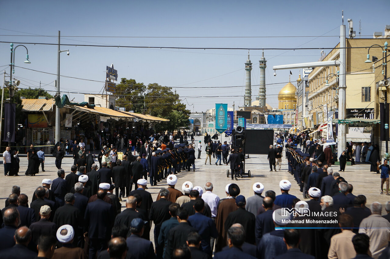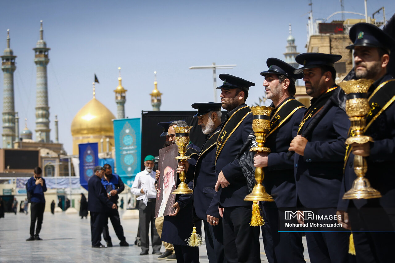 همزمان با روز شهادت امام محمد تقی جوادالائمه(ع)، خادمان حرم کریمه اهل بیت(ع) از مسجد امام حسن عسکری(ع) برای عرض تسلیت به سمت حرم حضرت فاطمه معصومه(س) حرکت کردند و در صحن امام رضا(ع) به عزاداری پرداختند.
