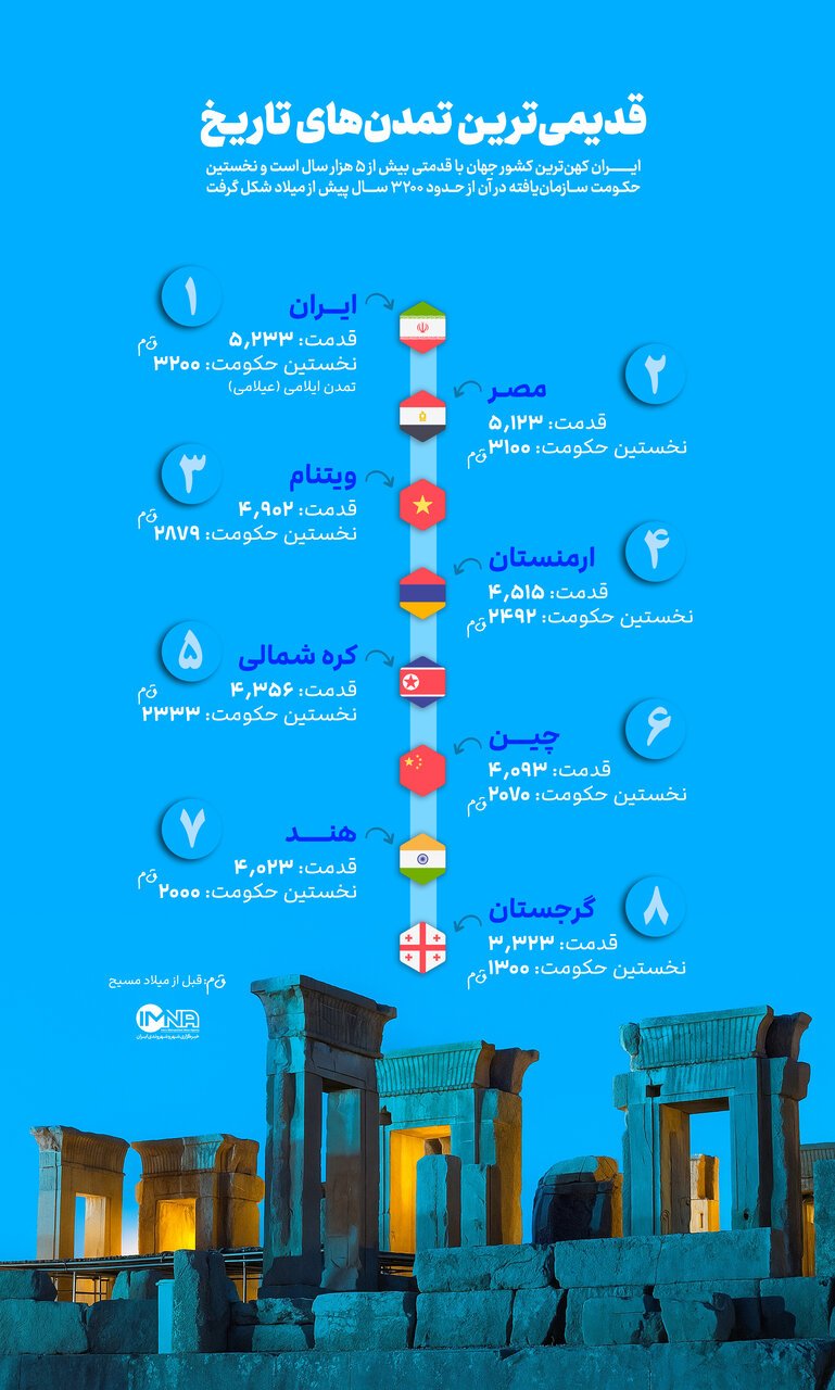 ایران با بیش از ۵۲۰۰ سال قدمت تاریخی، در صدر فهرست قدیمیترین کشورهای جهان قرار دارد؛ بر اساس بررسیها و منابع معتبر تاریخی در سال ۲۰۲۵ تمدن ایلامی یا عیلامی که در حدود ۳۲۰۰ سال پیش از میلاد در منطقه جنوب غربی ایران شکل گرفت، نخستین نمونه از حکومتهای سازمانیافته در این سرزمین است.