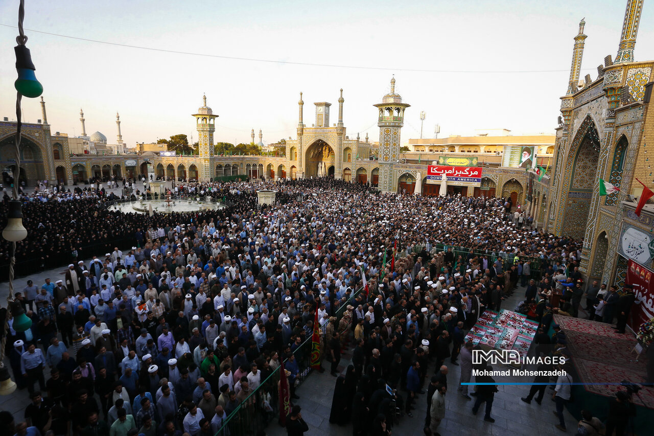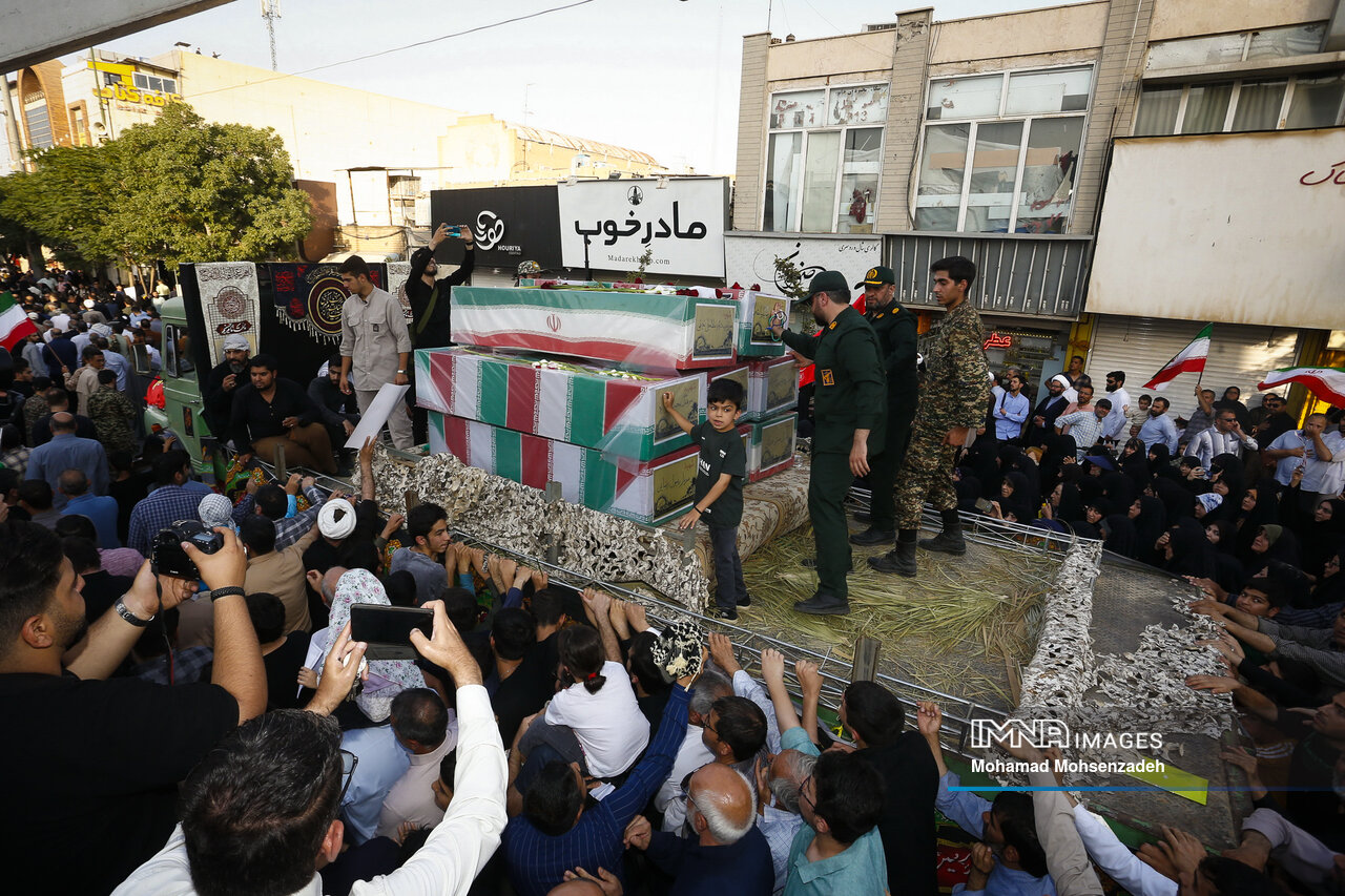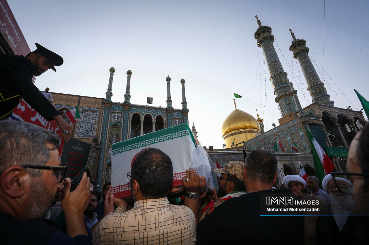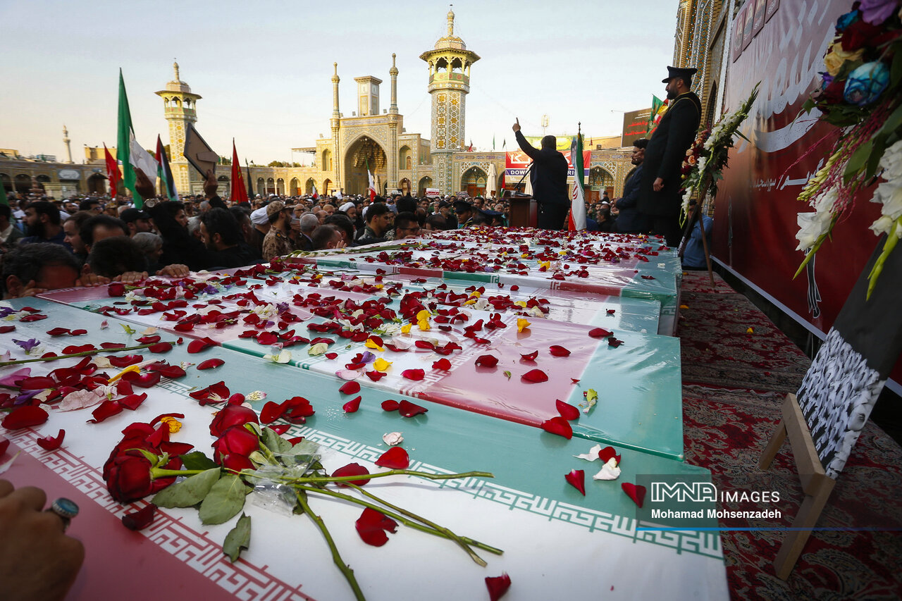 مراسم تشییع و تدفین شهدای تجاوز وحشیانه رژیم صهیونیستی امروز _دوشنبه بیستوششم خرداد_ از مصلای قدس تا حرم مطهر حضرت معصومه (س) برگزارشد.