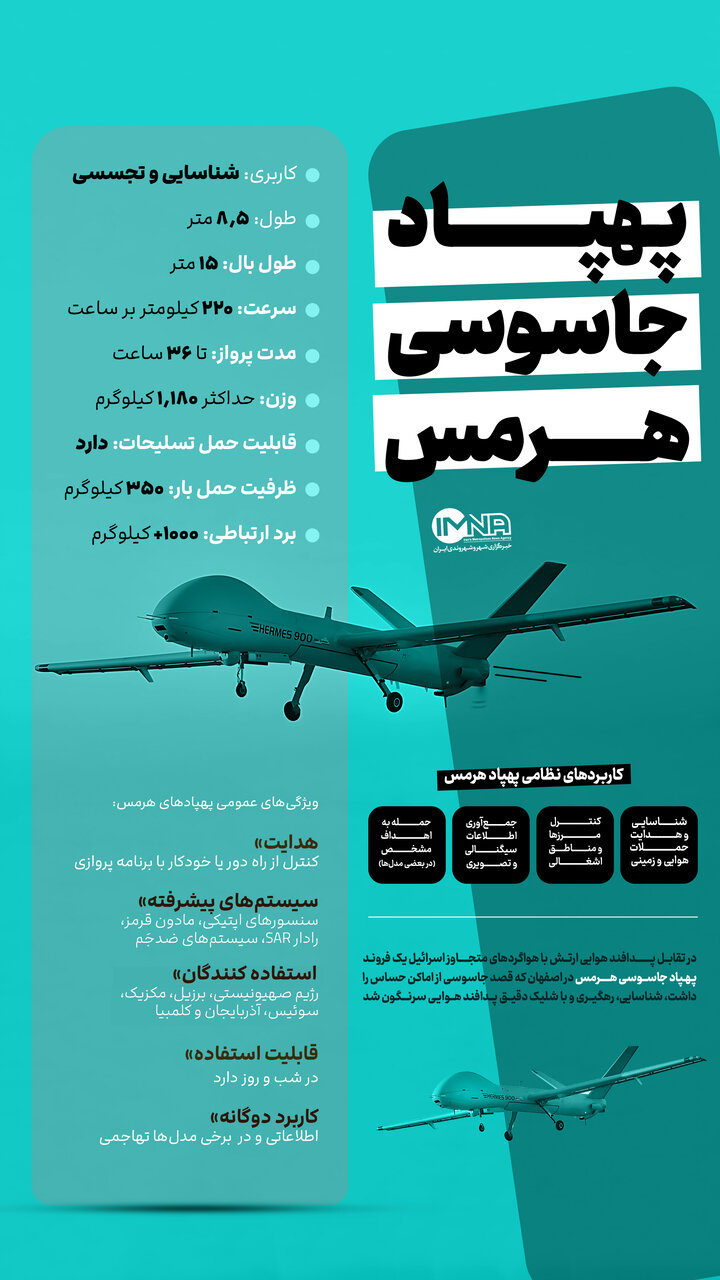 در تقابل پدافند هوایی ارتش جمهوری اسلامی ایران با هواگردهای متجاوز اسرائیل در اصفهان، یک فروند پهپاد جاسوسی هرمس سرنگون شد. مشخصات این پرنده فوق پیشرفته را میتوانید در این اینفوگرافیک مشاهده کنید.