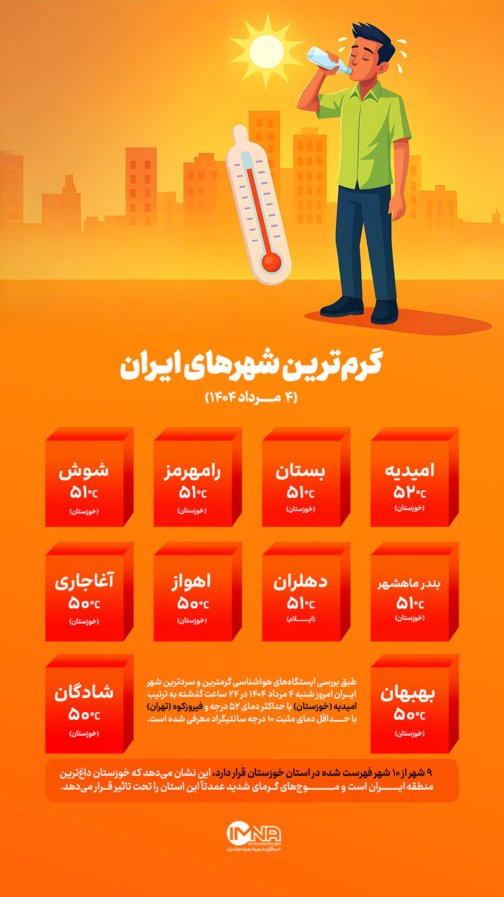 امروز ۴ مرداد ۱۴۰۴ امیدیه (خوزستان) با ثبت دمای ۵۲ درجه عنوان گرمترین شهر ایران را به خود اختصاص داد؛ در مقابل سردترین شهر ایران در ۲۴ ساعت گذشته نیر در فیروزکوه (تهران) بود؛ در این اینفوگرافیک گرمترین شهرهای ایران به ترتیب ارائه شده است.