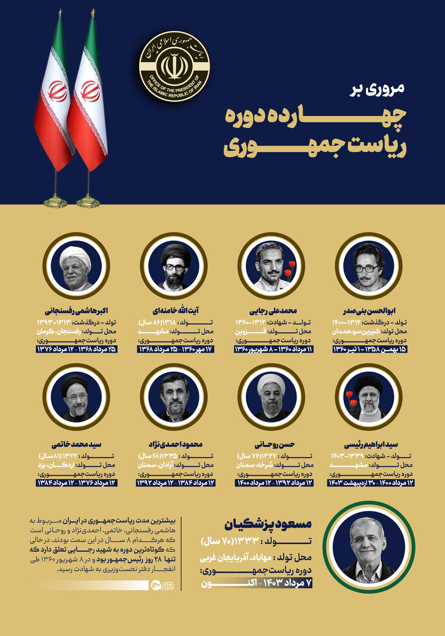 نگاهی جامع به ۱۴ دوره ریاستجمهوری ایران از آغاز جمهوری اسلامی ایران تا سال ۱۴۰۳ و اطلاعاتی از نام، محل تولد و مدت ریاست هر رئیسجمهور را بهصورت خلاصه و دقیق ببینید. در این مرور، مسیر تحولات سیاسی کشور و تغییر دولتها در بیش از چهار دهه به تصویر کشیده شده است.