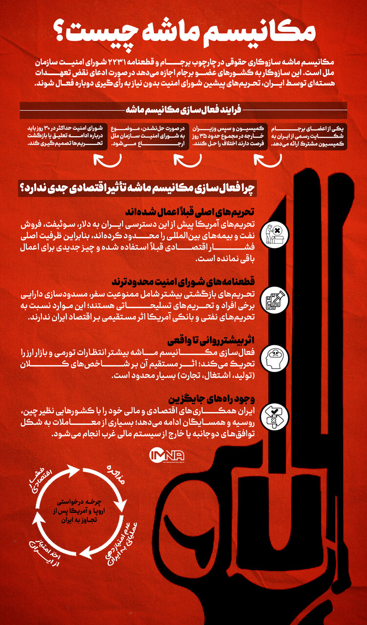 مکانیسم ماشه چیست؟ در صورت فعال شدن مکانیسم ماشه چه تحریمهایی علیه ایران اعمال میشود؟ مکانیسم ماشه چه تاثیری بر زندگی مردم دارد؟ تاثیر مکانیسم ماشه بر اقتصاد ایران چیست؟مکانیسم ماشه از جه زمانی اعمال میشود؟مراحل فعالسازی مکانیسم ماشه به چه صورت است؟ در این اینفوگرافیک به این سوالات پاسخ میدهیم.