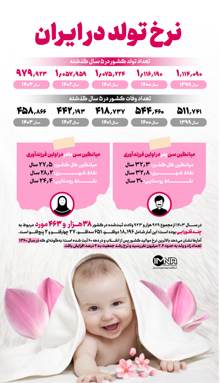 نرخ تولد در ایران طی سالهای اخیر بر خلاف نرخ مرگ و میر روندی کاهشی داشته است و میانگین سن پدر و مادر در نخستین فرزندآوری افزایش یافته است؛ این آمار نگرانکننده میتواند آینده جمعیتی کشور را تحتتأثیر قرار دهد.
