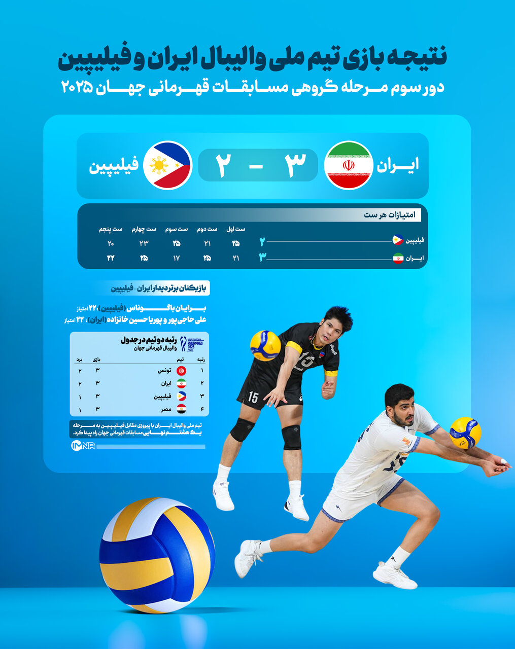 تیم ملی والیبال ایران امروز در سومین دیدار خود در رقابتهای قهرمانی مردان جهان مانیل به مصاف فیلیپین رفت که با نتیجه ۳ بر به ۲ به پیروزی رسید. آمار بازی و جدول گروه ایران را در ادامه مشاهده کنید.