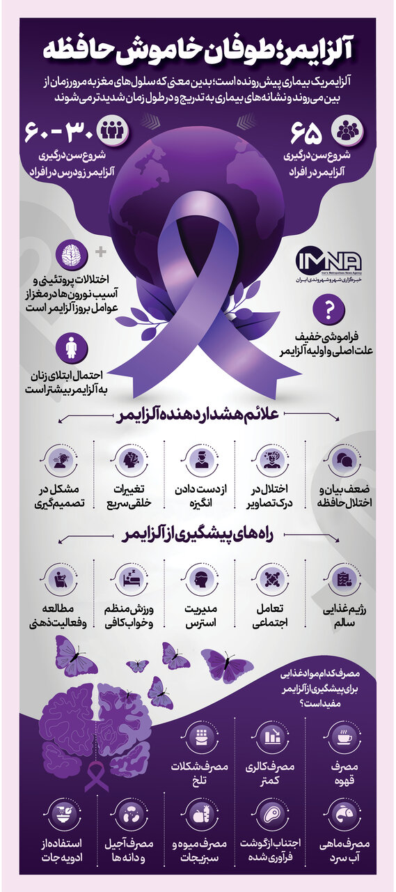 به بهانه ۲۱ سپتامبر، روز جهانی آلزایمر به بررسی علائم و راههای پیشگیری از این بیماری میپردازیم. آلزایمر یک بیماری زوال عصبی است که با علائم اولیه مثل فراموش کردن اتفاقات اخیر یا اختلال در یادگیری به آرامی آغاز شده و به مرور نشانههای آن شدیدتر میشود. در حال حاضر درمانی برای آلزایمر وجود ندارد.