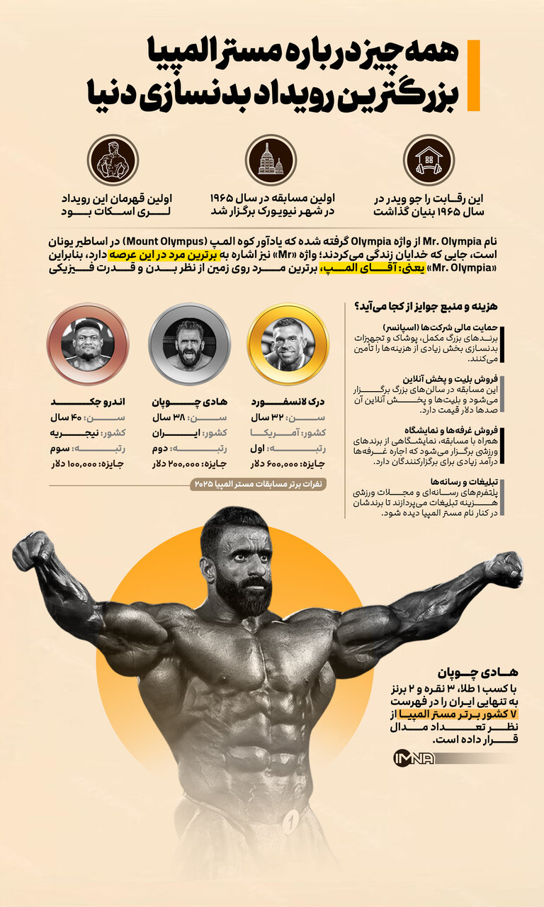 مسابقات مستر المپیا، معتبرترین رویداد بدنسازی دنیا از سال ۱۹۶۵ آغاز شده و قهرمانان بزرگی را به جهان معرفی کرده است. در سالهای اخیر، نام هادی چوپان با درخشش در این مسابقات و کسب ۱ طلا، ۳ نقره و ۲ برنز، ایران را در فهرست قدرتهای برتر بدنسازی جهان قرار داده است.