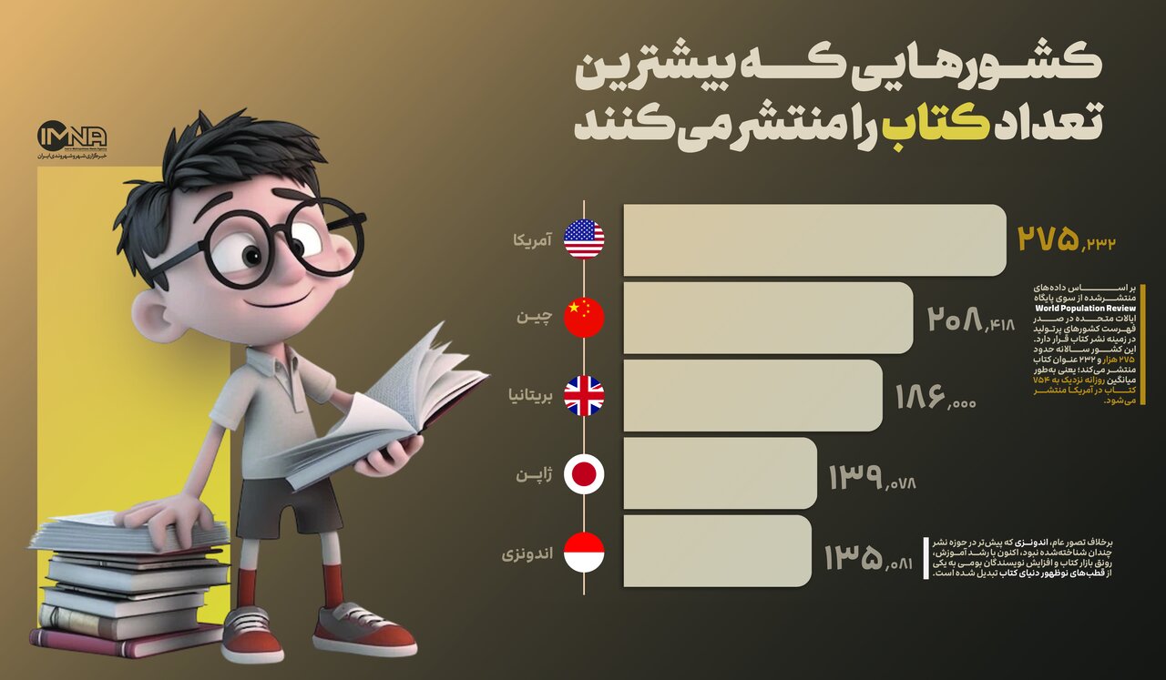 آمار جدید نشان میدهد آمریکا، چین، بریتانیا، ژاپن و اندونزی در صدر فهرست کشورهایی قرار دارند که بیشترین تعداد کتاب را منتشر میکنند. طبق دادههای World Population Review، ایالات متحده با انتشار بیش از ۲۷۵ هزار عنوان کتاب در سال، پیشتاز این رقابت فرهنگی است و روزانه حدود ۷۵۴ جلد کتاب چاپ میکند.