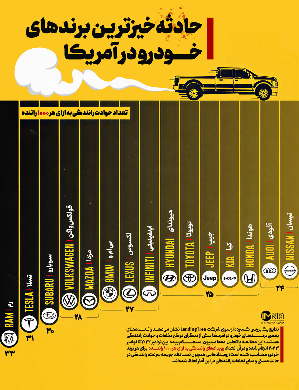 بر اساس پژوهش جدید شرکت LendingTree، برندهای Ram، Tesla و Subaru بیشترین آمار تصادفات رانندگی را در آمریکا دارند. این بررسی نشان میدهد در میان ۲۰ برند محبوب خودرویی، میزان بروز حادثه برای رانندگان این سه برند بهمراتب بالاتر از میانگین تصادف آمریکا بوده است.