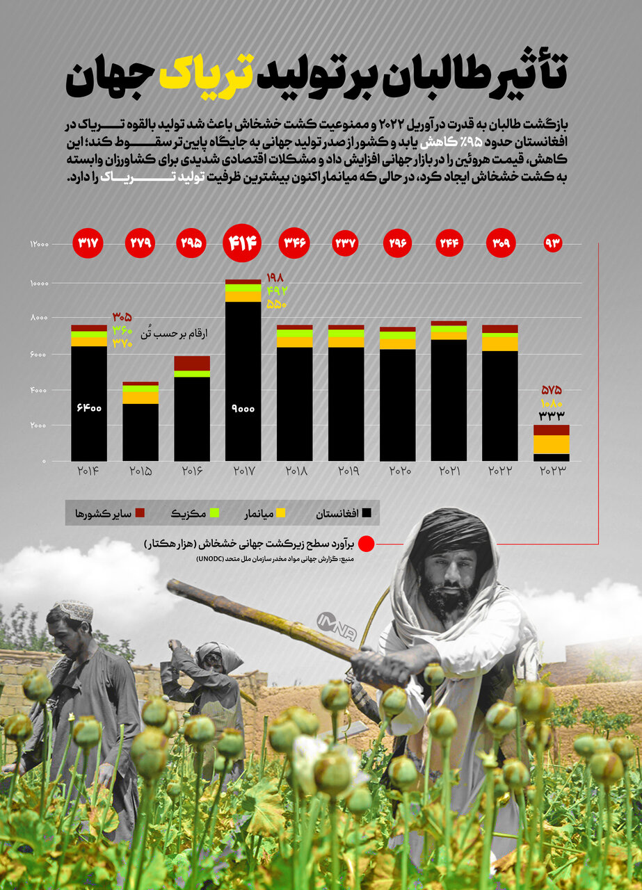 با بازگشت طالبان به قدرت در افغانستان و ممنوعیت کشت خشخاش از آوریل ۲۰۲۲، تولید جهانی تریاک با کاهش بیسابقهای مواجه شد. این اقدام موجب افت شدید تولید در افغانستان و در نتیجه افزایش قیمتها در بازار جهانی شد. کشور میانمار اکنون بیشترین ظرفیت تولید تریاک جهان را دارد.