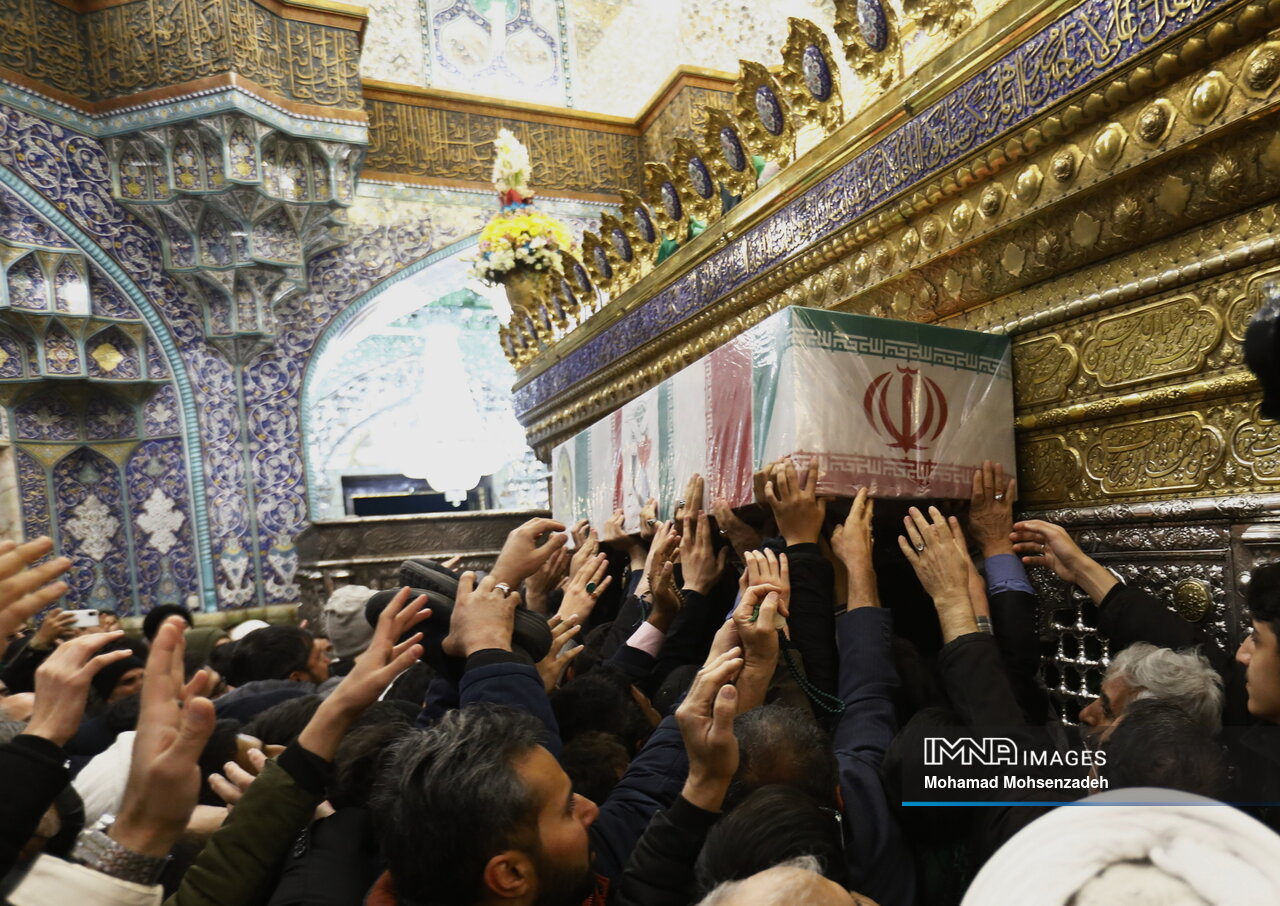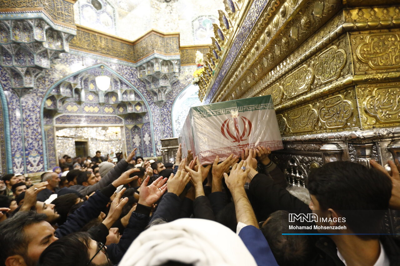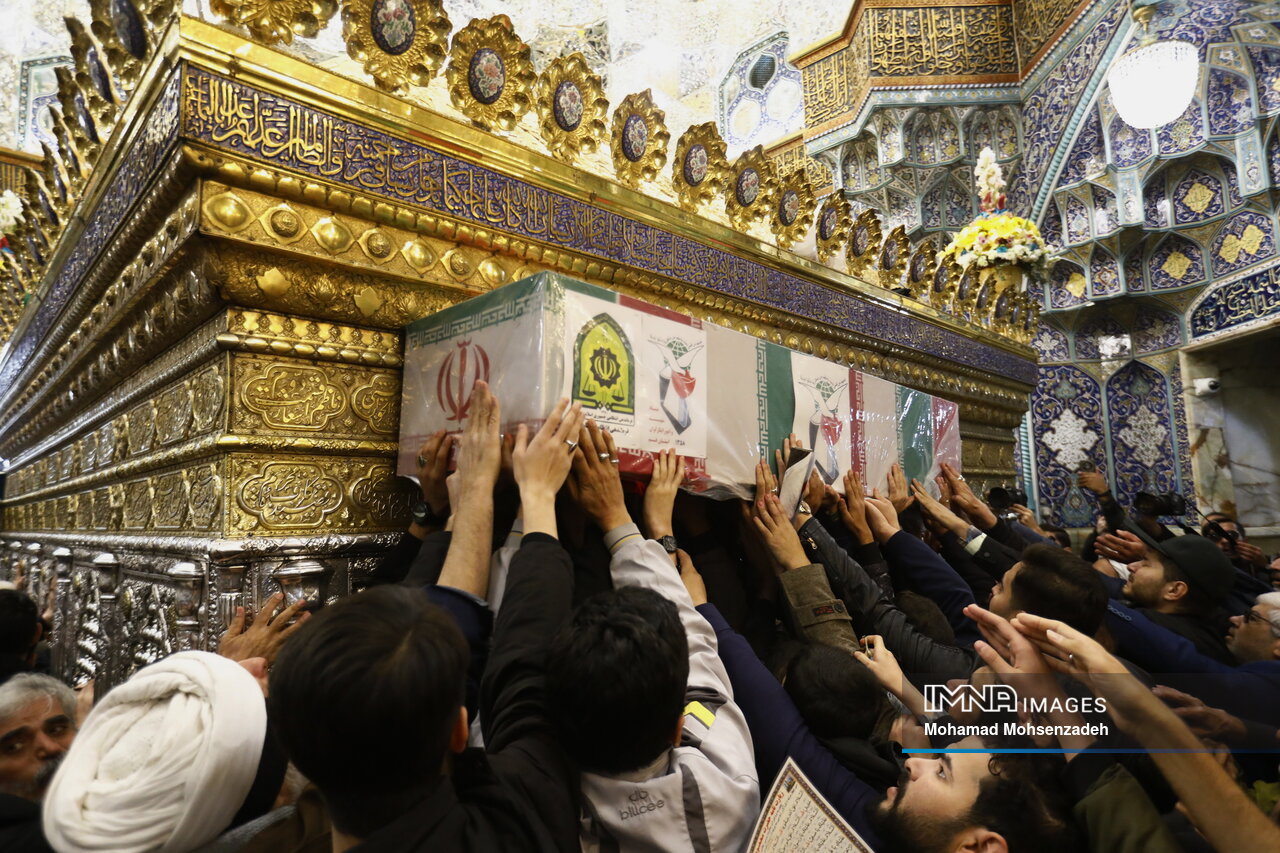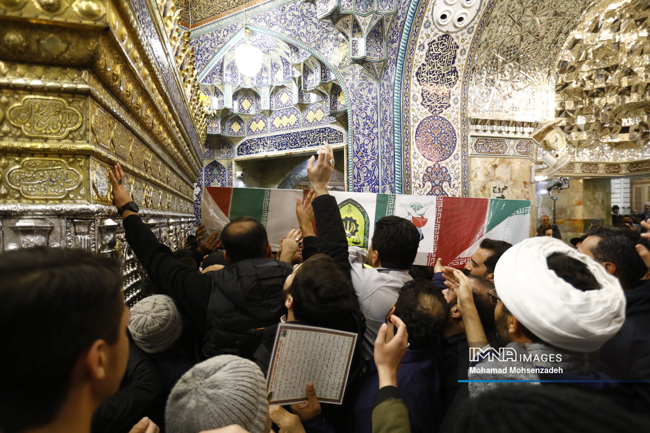 پیکر مطهر دو شهید مدافع امنیت که از نیروی انتظامی غیور استان قم بودند، تا حرم مطهر روی شانه‌های مردم داغدار قم حمل شد.