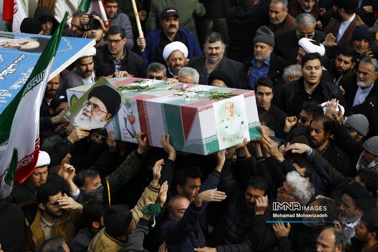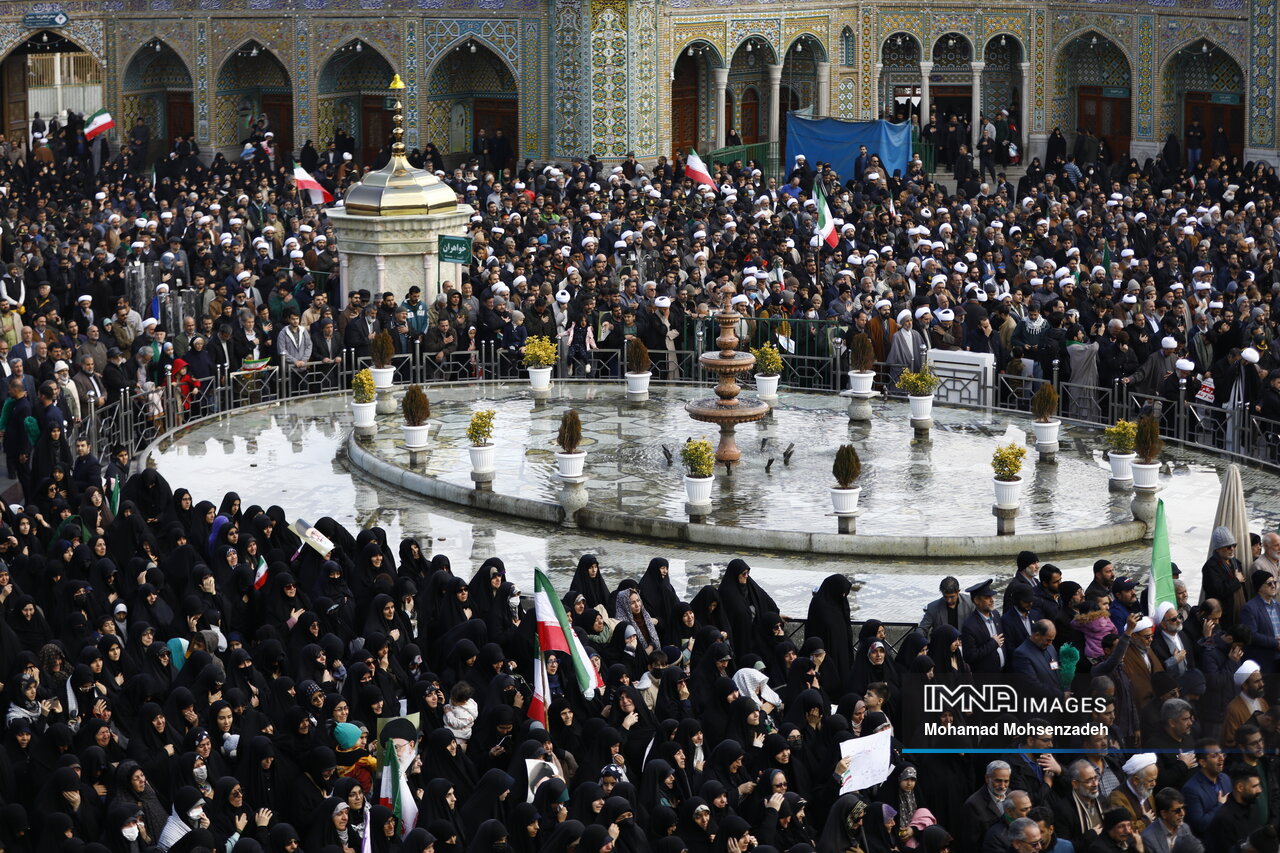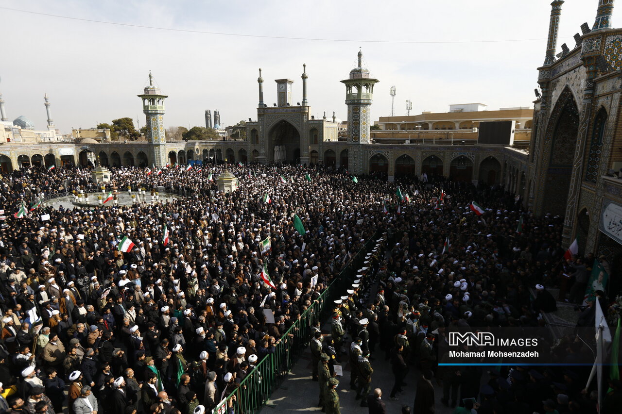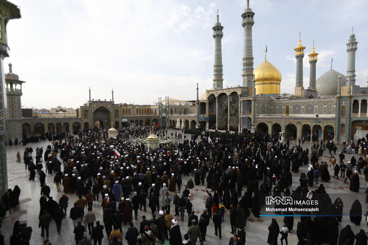 پیکر مطهر دو شهید مدافع امنیت که از نیروی انتظامی غیور استان قم بودند، تا حرم مطهر روی شانه‌های مردم داغدار قم حمل شد.